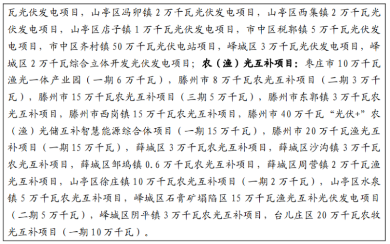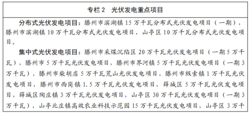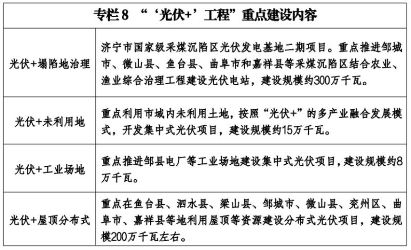 推進儲能工程建設(shè)。優(yōu)先發(fā)展大容量、高效率、長時間儲能設(shè)施,加快抽水蓄能、光伏制氫、海水淡化等儲能調(diào)峰工程建設(shè),實施微電網(wǎng)建設(shè)工程,建立以新能源電力為主體的新型供電模式。加快建設(shè)儲能產(chǎn)業(yè)園,重點發(fā)展鐵-鉻液流、鋰電池、熔鹽儲熱等儲能產(chǎn)業(yè),帶動上下游企業(yè)入園,力爭5年內(nèi)產(chǎn)值突破500億元。提升需求側(cè)響應(yīng)能力,完善終端消費儲能,加快推進臨朐抽水蓄能電站建設(shè),積極爭取青州朱崖、青州仁河抽水蓄能電站項目納入國家規(guī)劃,適時啟動項目建設(shè)。新增集中式風(fēng)電、光伏發(fā)電項目按不低于裝機容量10%配建或租賃儲能設(shè)施,配套儲能設(shè)施連續(xù)充電時間不低于2個小時。 濟寧市能源發(fā)展“十四五”規(guī)劃要求:到2025年,建成、在建可再生能源發(fā)電裝機總量達到800萬千瓦左右。其中光伏7GW,風(fēng)電0.95GW,儲能0.5GW。 光伏方面:提質(zhì)升級發(fā)展“光伏+”工程。發(fā)揮國家級基地引領(lǐng)效應(yīng),以創(chuàng)新引領(lǐng)推動新技術(shù)、新模式、新業(yè)態(tài)發(fā)展,促進太陽能光伏提質(zhì)升級,大力實施“光伏+”工程。到2025年,全市建成、在建光伏發(fā)電裝機總量達到700萬千瓦左右。 集中式光伏。重點深耕“光伏+塌陷地治理”基地。聚焦光伏和生態(tài)修復(fù)融合發(fā)展,重點推進鄒城市、微山縣、魚臺縣、曲阜市和嘉祥縣等采煤沉陷區(qū)結(jié)合農(nóng)業(yè)、漁業(yè)綜合治理工程建設(shè)光伏電站,大力推動濟寧市國家級采煤沉陷區(qū)光伏發(fā)電基地二期建設(shè),鼓勵新增塌陷地光伏+同步治理模式。積極推動“光伏+未利用地”融合發(fā)展模式。充分挖掘濟寧市行政區(qū)域內(nèi)未利用土地資源,結(jié)合生態(tài)修復(fù)、鄉(xiāng)村振興,采用“光伏+”多產(chǎn)業(yè)融合發(fā)展模式,開發(fā)一批集中式光伏項目。積極發(fā)展“光伏+工業(yè)用地”集中式發(fā)電。支持能源企業(yè)利用自有工業(yè)場地、園區(qū),積極發(fā)展集中式光伏。 分布式光伏。大力支持“光伏+屋頂”分布式發(fā)電。依托各縣(市、區(qū))開發(fā)區(qū)和各類工業(yè)園區(qū),合理利用工業(yè)廠房、商業(yè)企業(yè)、公共建筑、居民住宅等屋頂資源,積極發(fā)展分布式光伏,促進光伏發(fā)電就地生產(chǎn)、就地消納;以嘉祥、魚臺、梁山、曲阜和鄒城等縣(市、區(qū))為重點,進行整縣式分布式光伏開發(fā)建設(shè);在具備實施光伏條件的鄉(xiāng)村地區(qū),大力推廣光伏工程帶動鄉(xiāng)村振興模式;優(yōu)先發(fā)展“自發(fā)自用”分布式光伏。