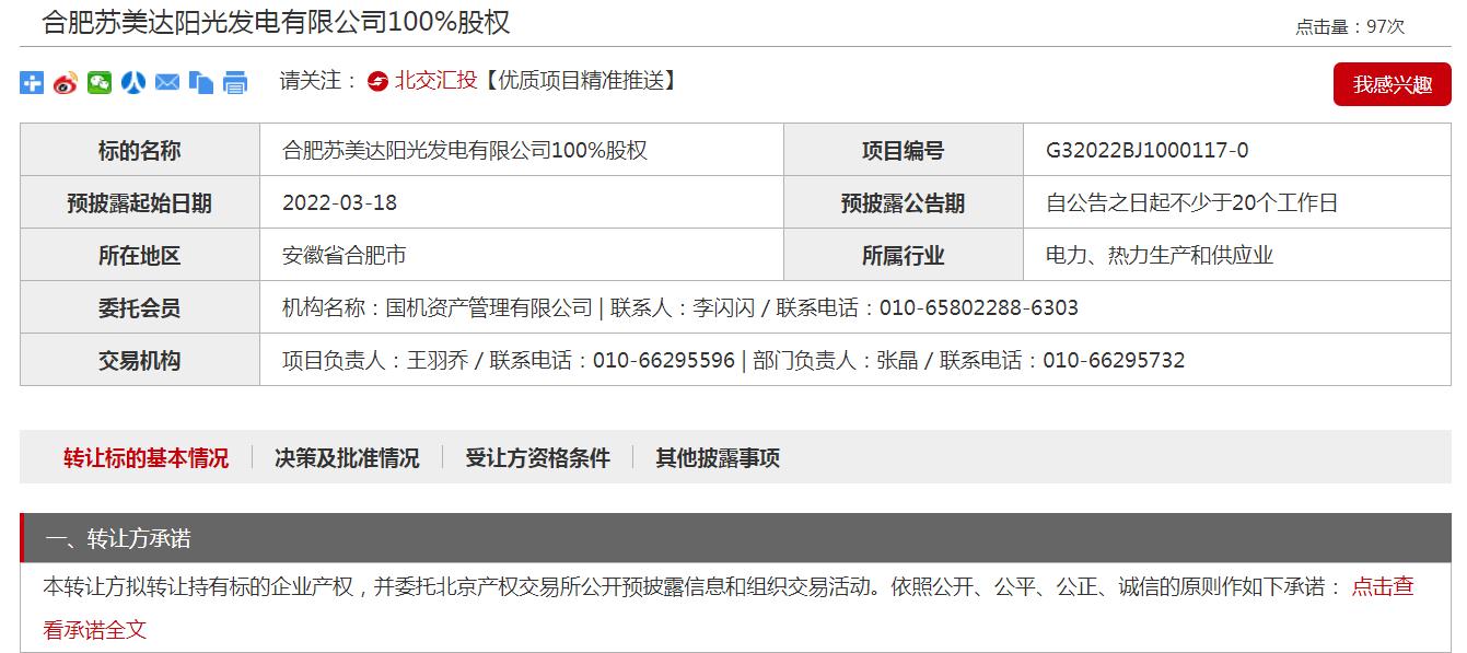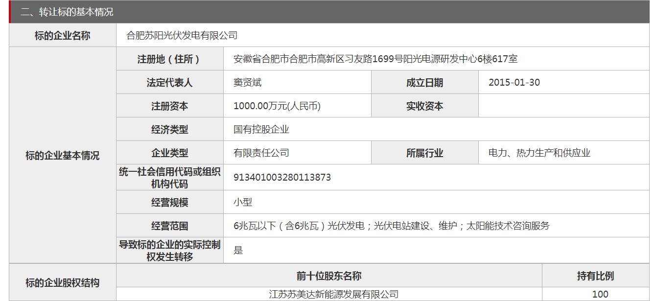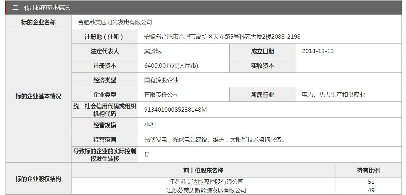 3、合肥蘇陽(yáng)光伏發(fā)電有限公司100%股權(quán) 預(yù)披露日期:自公告之日起不少于20個(gè)工作日 轉(zhuǎn)讓方名稱:江蘇蘇美達(dá)新能源發(fā)展有限公司