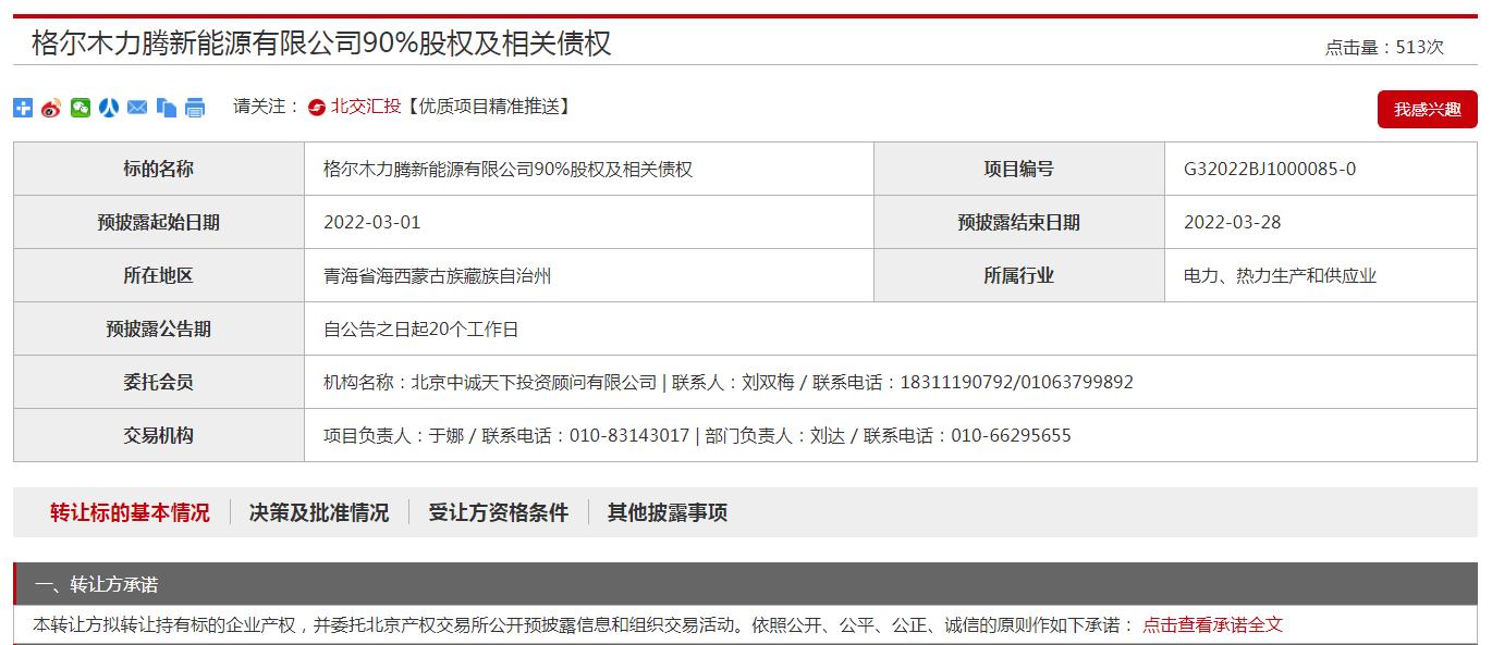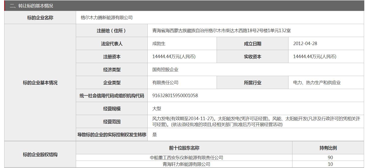 近日,中船集團(tuán)、國(guó)機(jī)集團(tuán)擬轉(zhuǎn)讓持有的幾家新能源公司股權(quán)。其中,中船集團(tuán)擬轉(zhuǎn)讓格爾木力騰新能源有限公司90%股權(quán)及相關(guān)債權(quán),國(guó)機(jī)集團(tuán)擬轉(zhuǎn)讓合肥清源汐太陽(yáng)能科技有限公司100%股權(quán)、合肥蘇陽(yáng)光伏發(fā)電有限公司100%股權(quán)、合肥蘇美達(dá)陽(yáng)光發(fā)電有限公司100%股權(quán)。 具體如下: 1、格爾木力騰新能源有限公司90%股權(quán)及相關(guān)債權(quán) 預(yù)披露日期:2023-03-01至2023-03-28 轉(zhuǎn)讓方名稱:中船重工西安東儀新能源有限責(zé)任公司