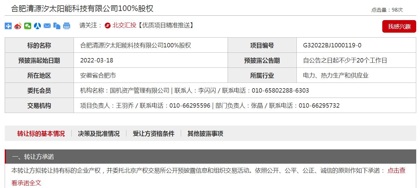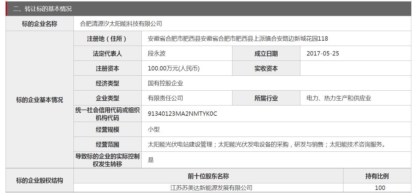 2、合肥清源汐太陽(yáng)能科技有限公司100%股權(quán) 預(yù)披露日期:自公告之日起不少于20個(gè)工作日 轉(zhuǎn)讓方名稱:江蘇蘇美達(dá)新能源發(fā)展有限公司
