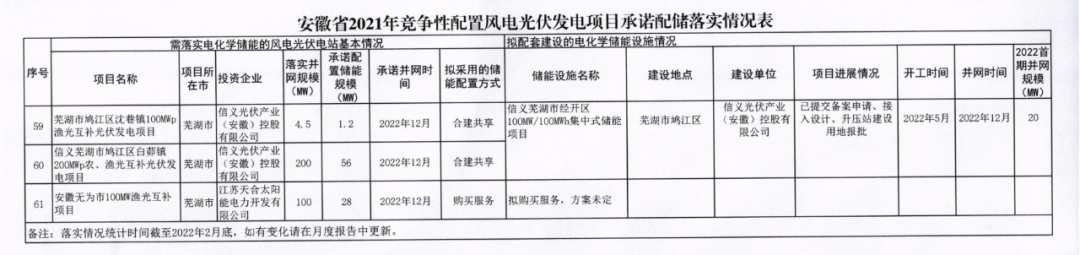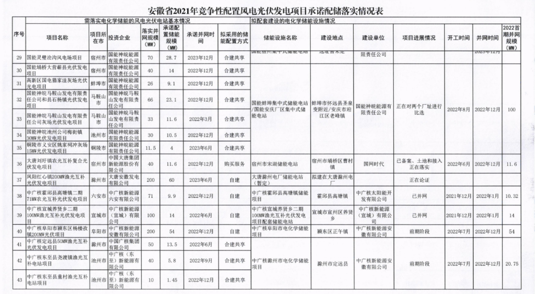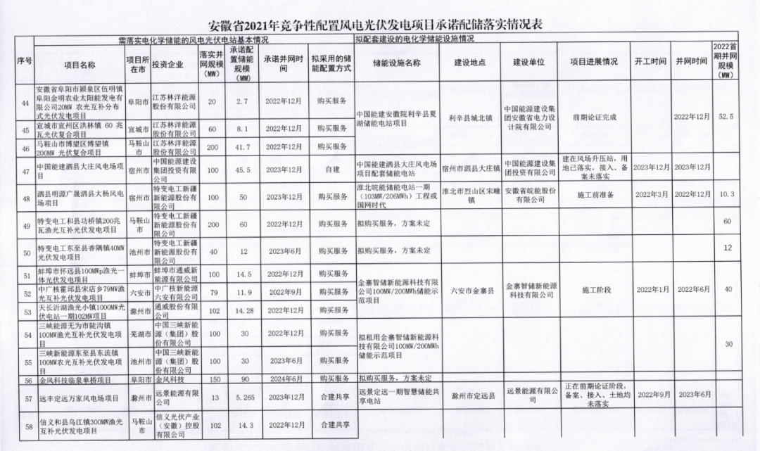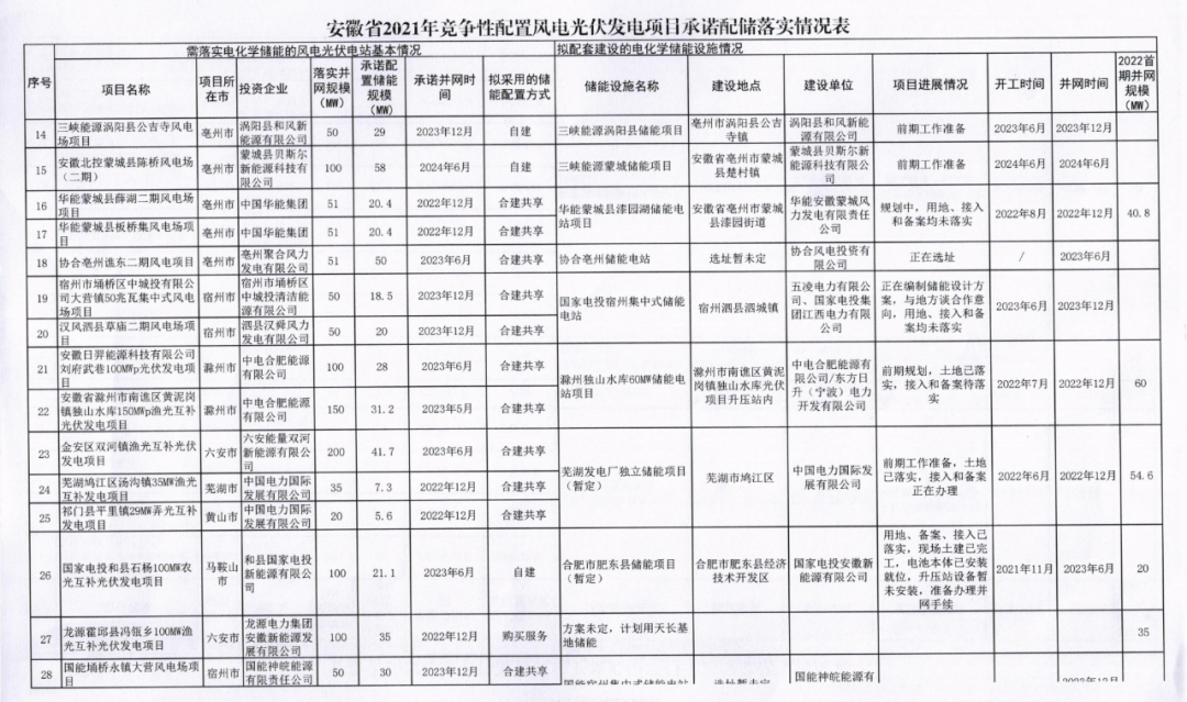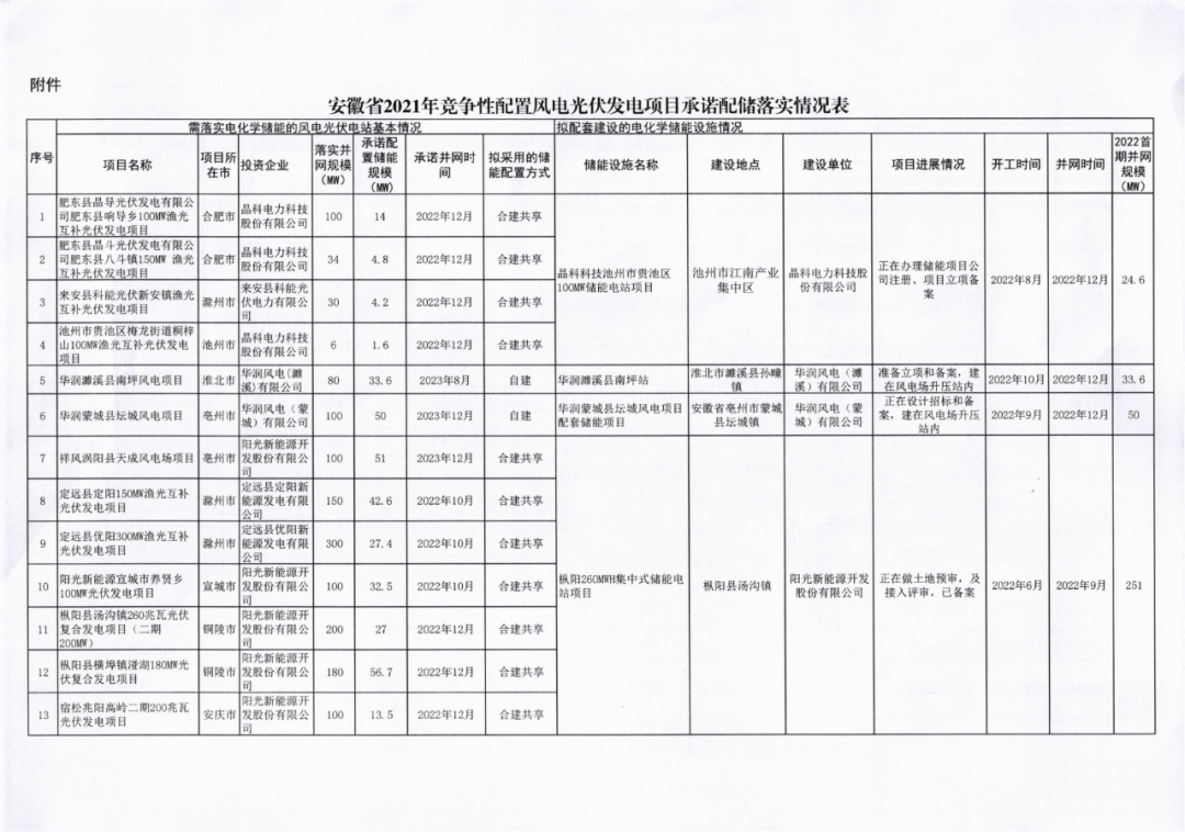 安徽省2021年競爭性配置風電光伏發(fā)電項目承諾配儲落實情況表