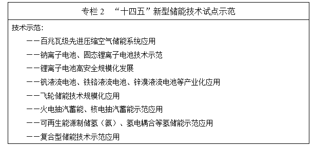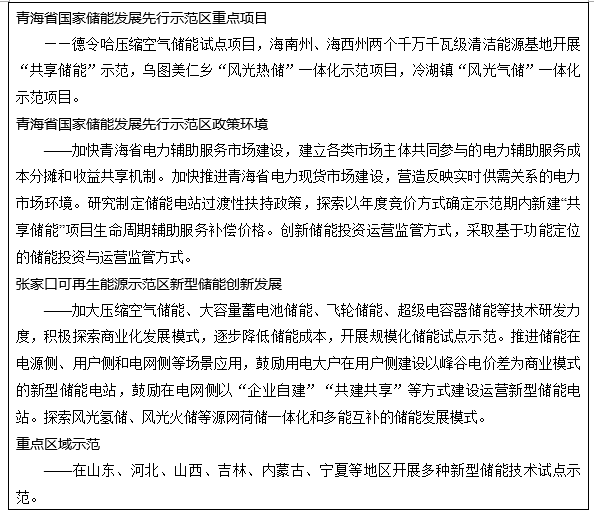 (二)推進(jìn)不同場景及區(qū)域試點(diǎn)示范 深化不同應(yīng)用場景試點(diǎn)示范。聚焦新型儲能在電源側(cè)、電網(wǎng)側(cè)、用戶側(cè)各類應(yīng)用場景,遴選一批新型儲能示范試點(diǎn)項(xiàng)目,結(jié)合不同應(yīng)用場景制定差異化支持政策。結(jié)合試點(diǎn)示范項(xiàng)目,深化不同應(yīng)用場景下儲能裝備、系統(tǒng)集成、規(guī)劃設(shè)計(jì)、調(diào)度運(yùn)行、安全防護(hù)、測試評價(jià)等方面的關(guān)鍵技術(shù)研究。 加快重點(diǎn)區(qū)域試點(diǎn)示范。積極開展區(qū)域性儲能示范區(qū)建設(shè),鼓勵各地因地制宜開展新型儲能政策機(jī)制改革試點(diǎn),推動重點(diǎn)區(qū)域新型儲能試點(diǎn)示范項(xiàng)目建設(shè)。結(jié)合以沙漠、戈壁、荒漠地區(qū)為重點(diǎn)的大型風(fēng)電光伏基地建設(shè)開展新型儲能試點(diǎn)示范;加快青海省國家儲能發(fā)展先行示范區(qū)建設(shè);加強(qiáng)河北、廣東、福建、江蘇等地首批科技創(chuàng)新(儲能)試點(diǎn)示范項(xiàng)目跟蹤評估;統(tǒng)籌推進(jìn)張家口可再生能源示范區(qū)新型儲能發(fā)展。鼓勵各地在具備先進(jìn)技術(shù)、人才隊(duì)伍和資金支持的前提下,大膽先行先試,開展技術(shù)創(chuàng)新、模式創(chuàng)新以及體制機(jī)制創(chuàng)新試點(diǎn)示范和應(yīng)用。 專欄4 “十四五”新型儲能區(qū)域示范