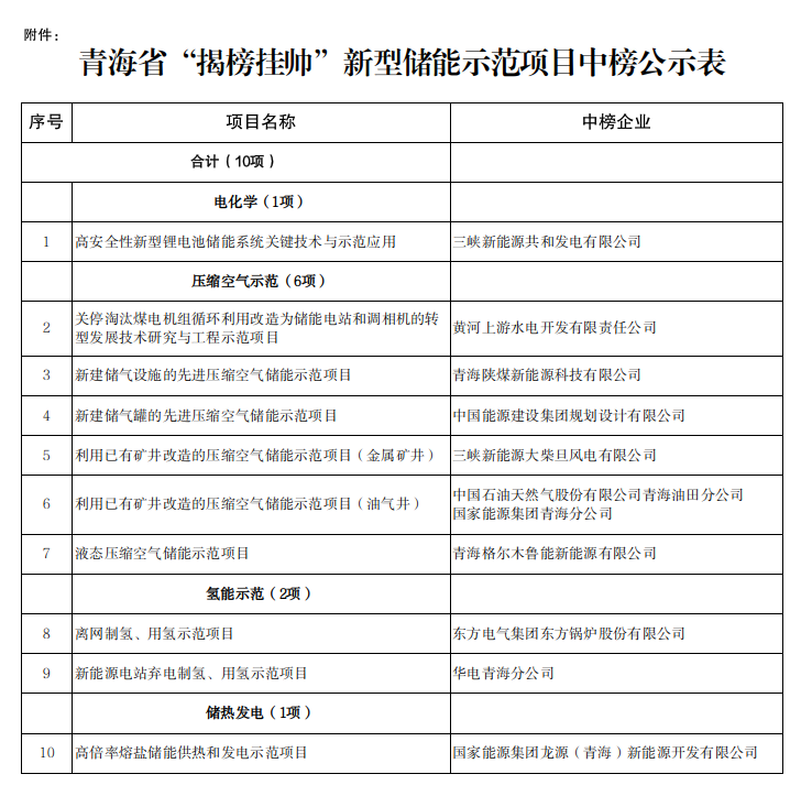 青海省發(fā)布“揭榜掛帥”新型儲能示范項目中榜公示3月21日,青海省發(fā)改委發(fā)布《關于青海省“揭榜掛帥”新型儲能 示范項目中榜公示》,共計10個儲能項目進入公示榜單,涉及鋰離子電池、壓縮空氣儲能、氫儲能、熔鹽儲熱等多項技術。 項目如下: 1、高安全性新型鋰電池儲能系統(tǒng)關鍵技術與示范應用 2、關停淘汰煤電機組循環(huán)利用改造為儲能電站和調相機的轉型發(fā)展技術研究與工程示范項目 3、新建儲氣設施的先進壓縮空氣儲能示范項目 4、新建儲氣罐的先進壓縮空氣儲能示范項目 5、利用已有礦井改造的壓縮空氣儲能示范項目(金屬礦井) 6、利用已有礦井改造的壓縮空氣儲能示范項目(油氣井) 7、液態(tài)壓縮空氣儲能示范項目 8、離網制氫、用氫示范項目 9、新能源電站棄電制氫、用氫示范項目 10、高倍率熔鹽儲能供熱和發(fā)電示范項目 具體的項目中榜企業(yè)如下表