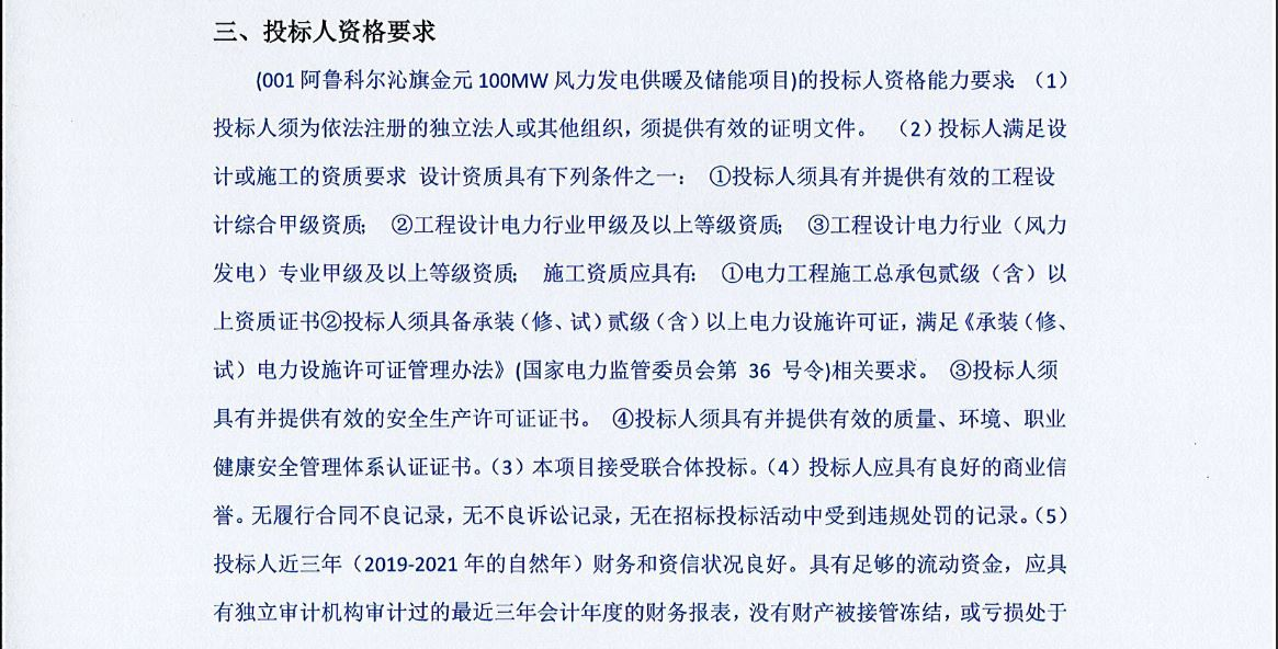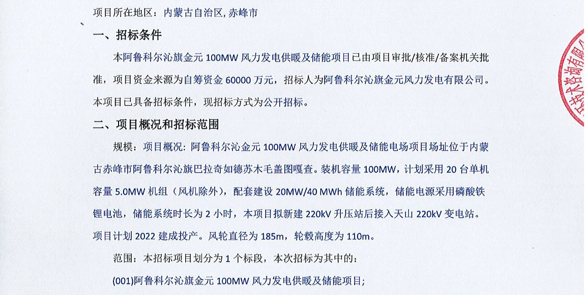 阿魯科爾沁旗金元100MW風力發(fā)電供暖及儲能項目招標公告3月22日內(nèi)蒙古赤峰發(fā)布阿魯科爾沁旗金元100MW風力發(fā)電供暖及儲能項目招標公告。公告稱,項目計劃配備20MW/40MWh儲能系統(tǒng),儲能電源采用磷酸鐵鋰電池,儲能系統(tǒng)時長兩小時。項目資金來源自籌資金60000萬元。公告具體內(nèi)容如下: