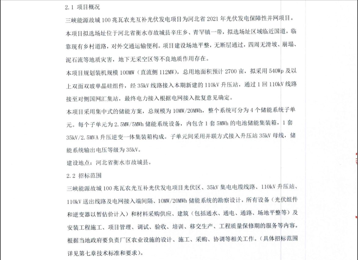 三峽能源故城100兆瓦農(nóng)光互補(bǔ)光伏發(fā)電項(xiàng)目EPC總承包招標(biāo)公告3月22日公布三峽能源故城100兆瓦農(nóng)光互補(bǔ)光伏發(fā)電項(xiàng)目EPC總承包招標(biāo)公告。公告披露項(xiàng)目位于河北省衡水市故城縣辛鄉(xiāng)莊、青罕鎮(zhèn)一帶,項(xiàng)目總規(guī)模10MW/20MWh,整個(gè)系統(tǒng)可分為四個(gè)儲(chǔ)能系統(tǒng)總單元。公告具體內(nèi)容如下: