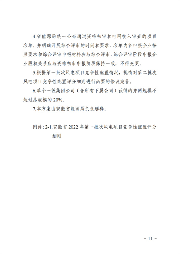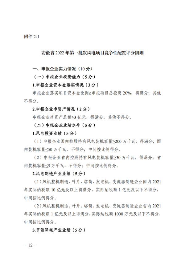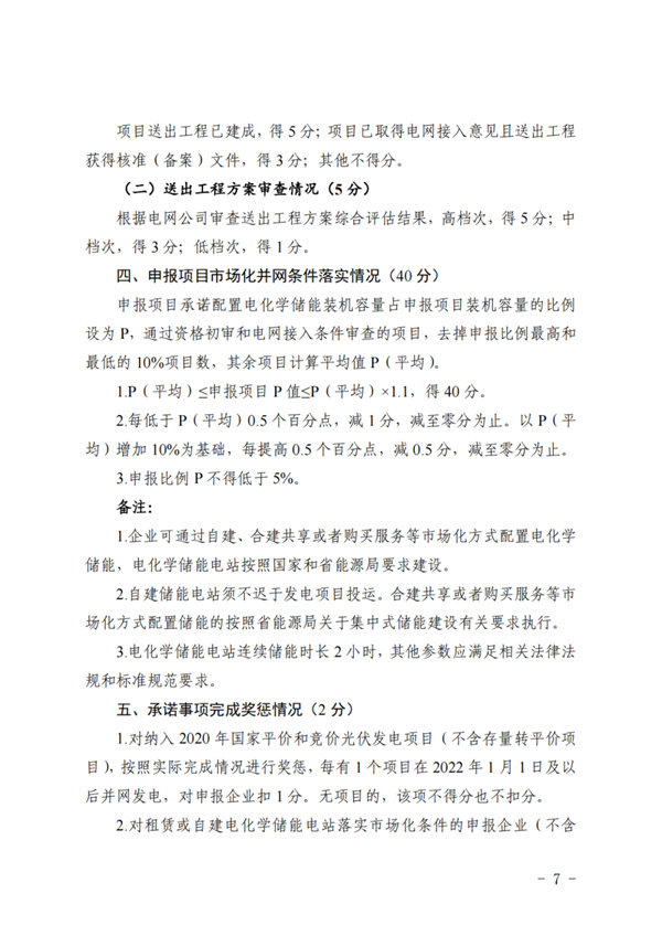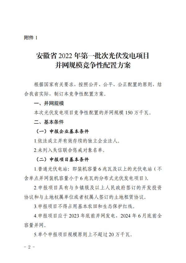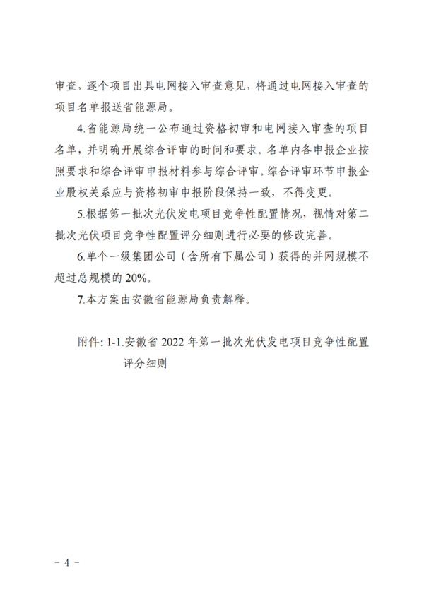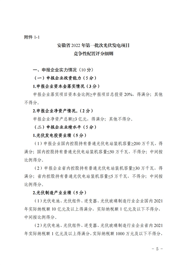 3月29日,安徽省能源局印發(fā)《關(guān)于征求2022年第一批次光伏發(fā)電和風(fēng)電項(xiàng)目并網(wǎng)規(guī)模競爭性配置方案意見的函》,擬安排1.5GW光伏、1GW風(fēng)電項(xiàng)目,并就競爭性配置方案給出指導(dǎo)意見。 根據(jù)文件,本次申報(bào)為6MW以上光伏電站,須與鎮(zhèn)級(jí)及以上人民政府簽訂開發(fā)投資協(xié)議和與土地權(quán)屬單位或者權(quán)屬人簽訂的土地租賃協(xié)議,不得占用基本農(nóng)田,單體項(xiàng)目規(guī)模不得超過200MW,擬申報(bào)源網(wǎng)荷儲(chǔ)一體化和多能互補(bǔ)的光伏發(fā)電項(xiàng)目不參與本次申報(bào)。申報(bào)項(xiàng)目應(yīng)在2023年底前建成并網(wǎng),2024年6月底前全容量并網(wǎng)。 項(xiàng)目申報(bào)先經(jīng)過各市發(fā)改委初審,再進(jìn)入省能源局復(fù)審,滿足條件的項(xiàng)目由省電力公司進(jìn)行統(tǒng)一的電網(wǎng)接入審查,最終進(jìn)入終審環(huán)節(jié),根據(jù)具體的評(píng)分細(xì)則進(jìn)行打分。單一集團(tuán)公司所得項(xiàng)目規(guī)模不能超過300MW。 在具體評(píng)分細(xì)則方面,申報(bào)企業(yè)投資投資能力占比10%,分為資本金落實(shí)情況和企業(yè)業(yè)績水平。其中,企業(yè)業(yè)績水平為5分,分別可從光伏電站持有量、光伏制造業(yè)國內(nèi)、省內(nèi)納稅額度(10億元、1億元)以及節(jié)能降耗產(chǎn)業(yè)業(yè)績獲取分值。 項(xiàng)目用地落實(shí)情況占比40%,分別為土地租賃合同面積與規(guī)模申報(bào)匹配程度,縣級(jí)政府按規(guī)定格式出具支持項(xiàng)目建設(shè)承諾,自然資源、林業(yè)、水利、環(huán)保、軍事、文物部門支持意見以及項(xiàng)目取得用地預(yù)審情況。電網(wǎng)接入情況占比10%,具體為送出工程建設(shè)情況與以及送出工程方案預(yù)審。 市場化并網(wǎng)條件落實(shí)情況占比40%,主要通過申報(bào)項(xiàng)目承諾配置電化學(xué)儲(chǔ)能裝機(jī)容量占申報(bào)項(xiàng)目裝機(jī)容量的比例進(jìn)行評(píng)分,但最低比例不得低于5%,時(shí)長不得低于2小時(shí)。 此外,還有額外2分的承諾事項(xiàng)完成獎(jiǎng)懲情況,對(duì)納入2020年國家平價(jià)和競價(jià)光伏發(fā)電項(xiàng)目,每有1個(gè)項(xiàng)目在2022年1月1日及以后并網(wǎng)發(fā)電的,對(duì)申報(bào)企業(yè)扣1分,無項(xiàng)目不得分也不扣分。對(duì)配儲(chǔ)能電站,每有1萬千瓦租賃或自建電化學(xué)儲(chǔ)能電站于綜合評(píng)審前建成并網(wǎng)的,對(duì)申報(bào)企業(yè)加0.1分。 若評(píng)分相同則儲(chǔ)能配比比例高的優(yōu)先,若比例也相同則以用地落實(shí)情況得分較高的項(xiàng)目優(yōu)先。 全文如下: