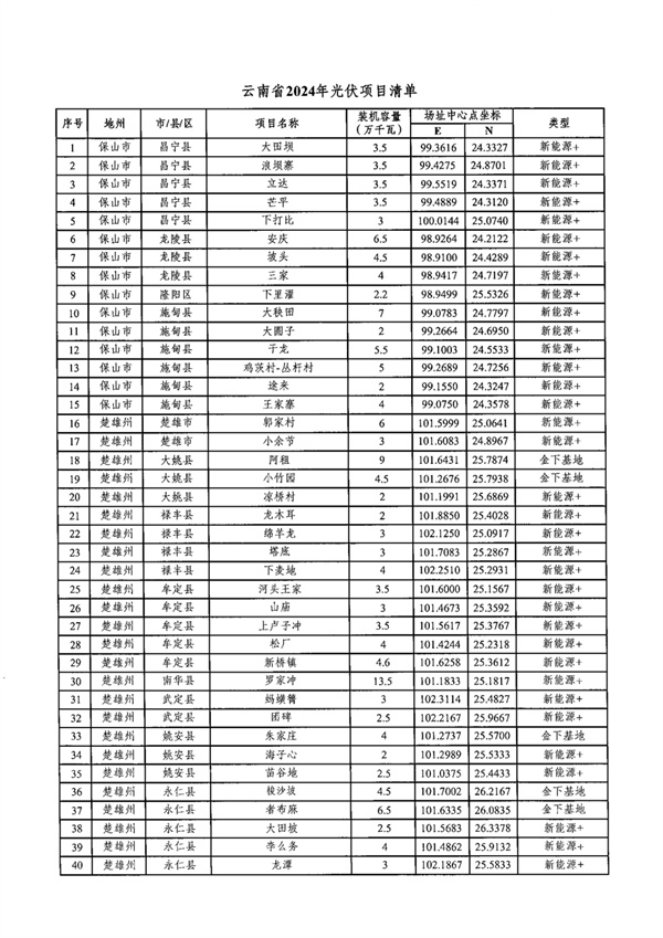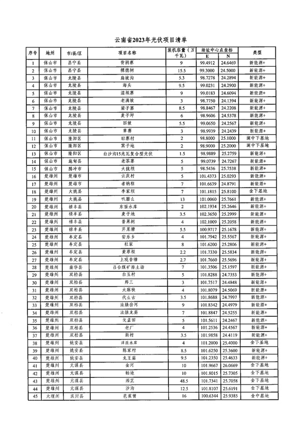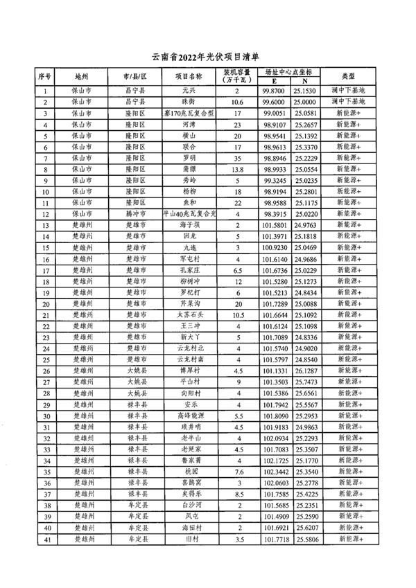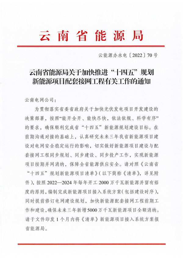 4月8日,云南省能源局《關(guān)于加快推進“十四五”規(guī)劃新能源項目配套接網(wǎng)工程有關(guān)工作的通知》。為確保順利完成全省“十四五”新能源規(guī)劃建設(shè)目標,切云南省發(fā)改委要求實做好新能源項目建設(shè)與配套接網(wǎng)工程同步規(guī)劃、同步建設(shè)、同步投產(chǎn)工作,實現(xiàn)新能源項目按期并網(wǎng)消納,保障全省能源供應(yīng)安全。 根據(jù)《云南省“十四五”規(guī)劃新能源項目清單》,按照2022-2024年每年開工2000萬千瓦新能源并留有裕度的原則,編制完成新能源項目接入系統(tǒng)方案(包括建設(shè)時序),同時提前修訂電網(wǎng)建設(shè)規(guī)劃,加快新能源配套接網(wǎng)工程前期工作和建設(shè),確保未來三年新增5000萬千瓦新能源項目全額消納。并要求文件印發(fā)1個月內(nèi)將《清單》新能源項目接入系統(tǒng)方案報省能源局。 云南省“十四五”規(guī)劃新能源項目清單中,2022年-2024年共計5450萬千瓦新能源項目。其中2022年2102萬千瓦;2023年1792萬千瓦;2024年1557萬千瓦。 5450萬千瓦項目主要包括紅河基地636萬千瓦、金下基地423萬千瓦、金中基地285萬千瓦、瀾金上基地228萬千瓦、瀾中下基地346萬千瓦、曲靖火風(fēng)光基地292萬千瓦、新能源+3240萬千瓦。 2021年云南省風(fēng)電、光伏項目清單共1858.9萬千瓦,其中光伏966.3萬千瓦;風(fēng)電892.6萬千瓦。 以上新能源項目均要求建設(shè)與配套接網(wǎng)工程同步規(guī)劃、同步建設(shè)、同步投產(chǎn)工作,實現(xiàn)新能源項目按期并網(wǎng)消納,保障全省能源供應(yīng)安全。 具體內(nèi)容如下: