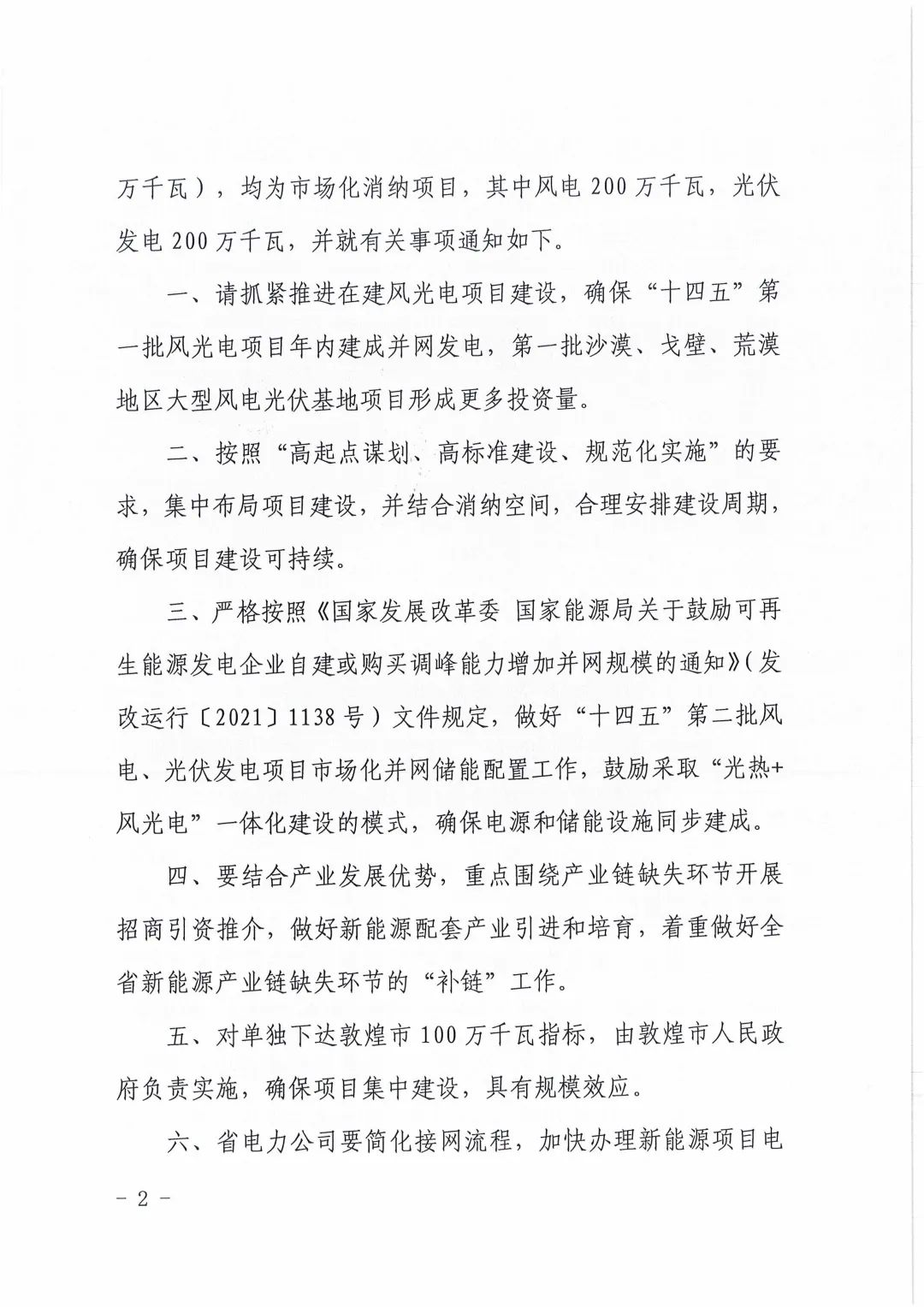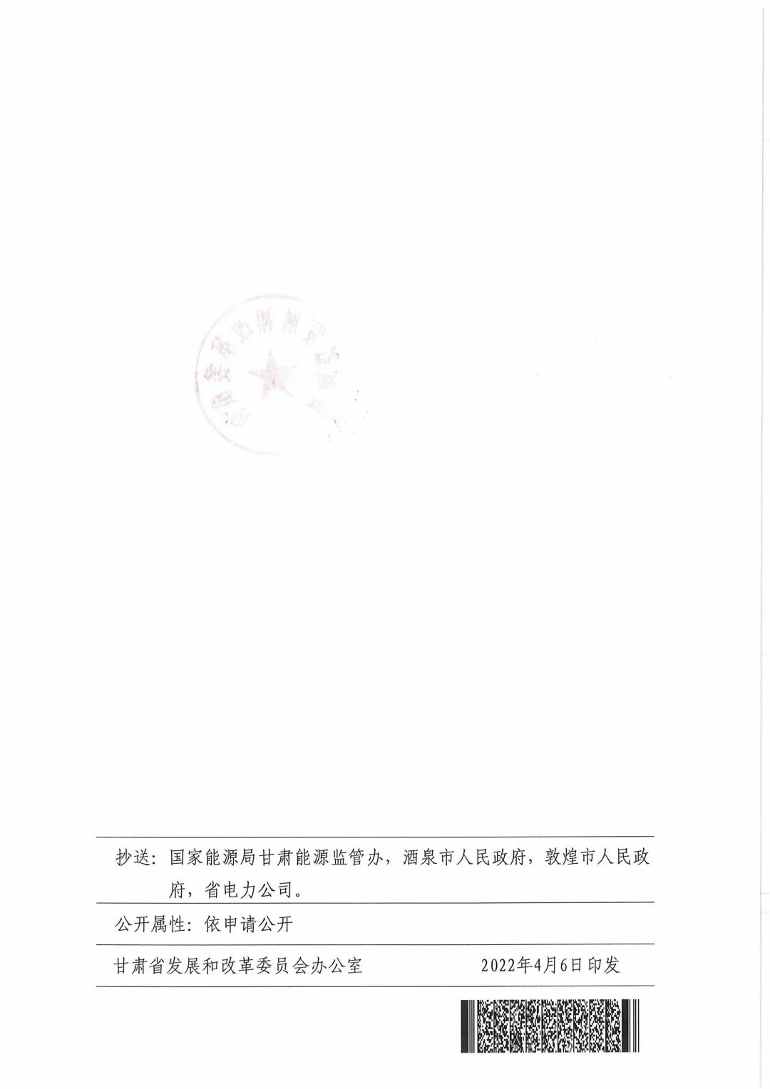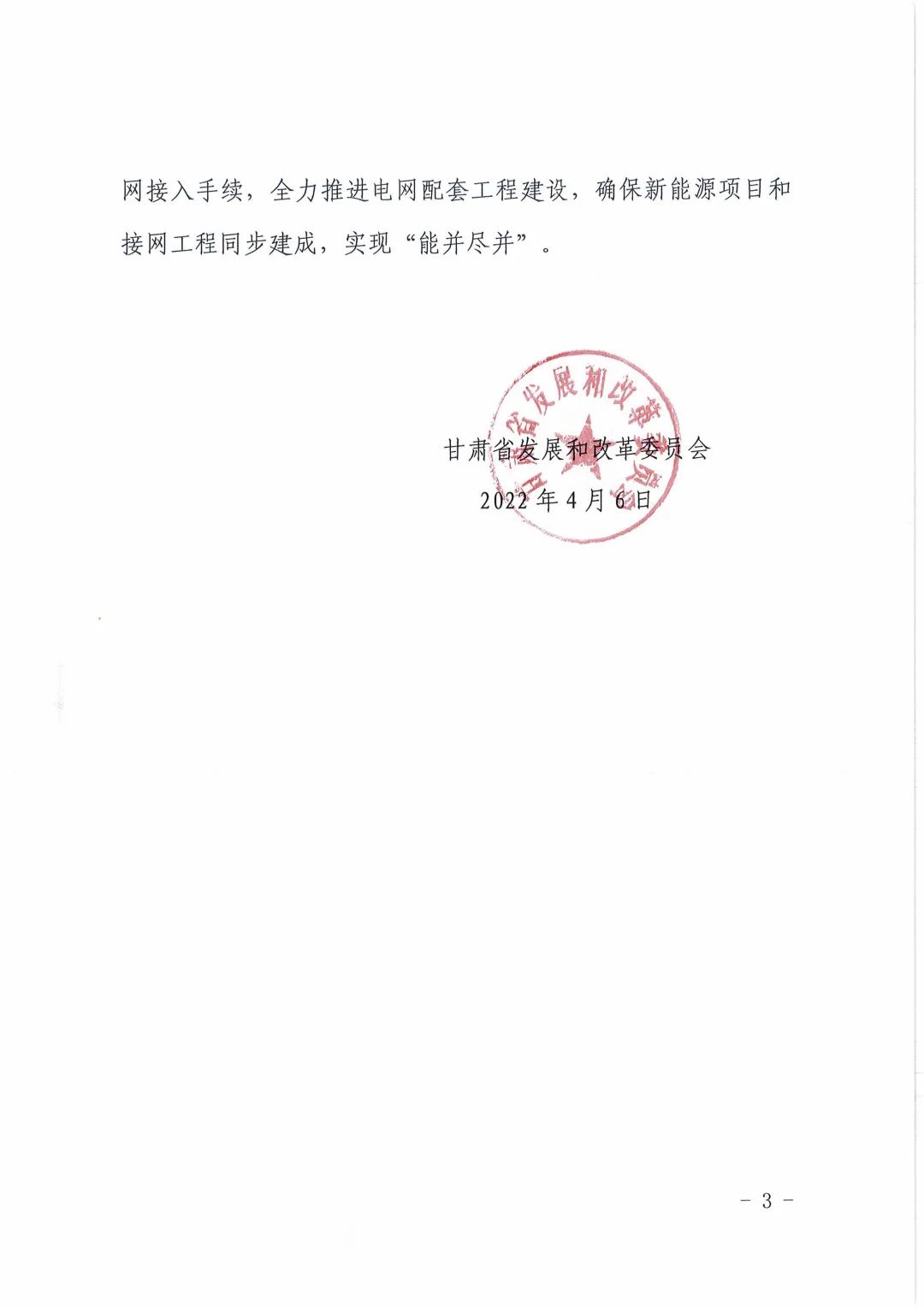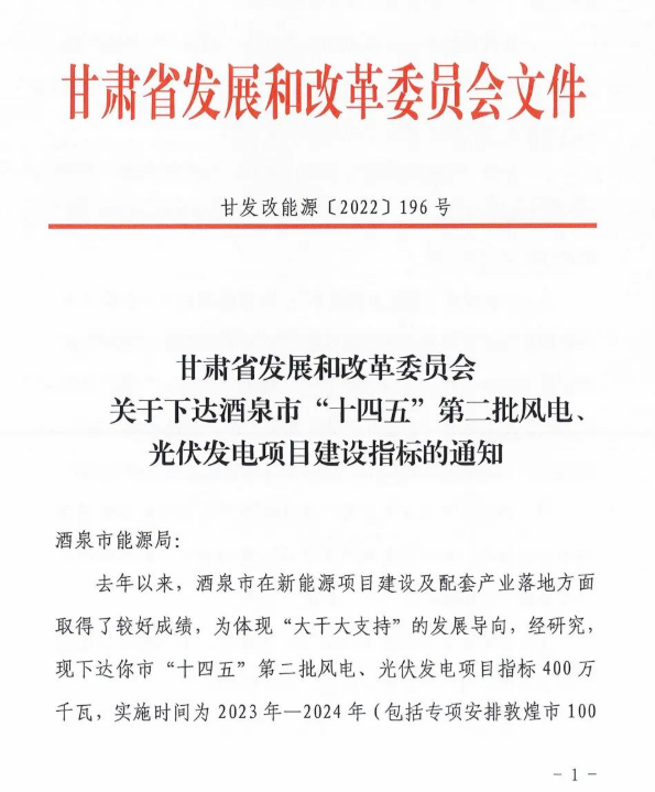 4月6日,甘肅省發(fā)展和改革委員會(huì)下發(fā)《關(guān)于下達(dá)酒泉市“十四五”第二批風(fēng)電、光伏發(fā)電項(xiàng)目建設(shè)指標(biāo)的通知》(甘發(fā)改能源〔2022)196號(hào))?!锻ㄖ诽岢鼍迫?quot;十四五"第二批風(fēng)電、光伏發(fā)電項(xiàng)目指標(biāo)為400萬(wàn)千瓦,實(shí)施時(shí)間為2023-2024年(包括專項(xiàng)安排敦煌市100萬(wàn)千瓦),均為市場(chǎng)化消納項(xiàng)目,其中風(fēng)電200萬(wàn)千瓦,光伏發(fā)電200萬(wàn)千萬(wàn)。 并鼓勵(lì)采取“光熱+風(fēng)光電”一體化建設(shè)的模式,確保電源和儲(chǔ)能設(shè)施同步建成;省電力公司要簡(jiǎn)化接網(wǎng)流程,加快辦理新能源項(xiàng)目電網(wǎng)接入手續(xù),全力推進(jìn)電網(wǎng)配套工程建設(shè),確保新能源項(xiàng)目和接網(wǎng)工程同步建成,實(shí)現(xiàn)“能并盡并”。 原文如下
