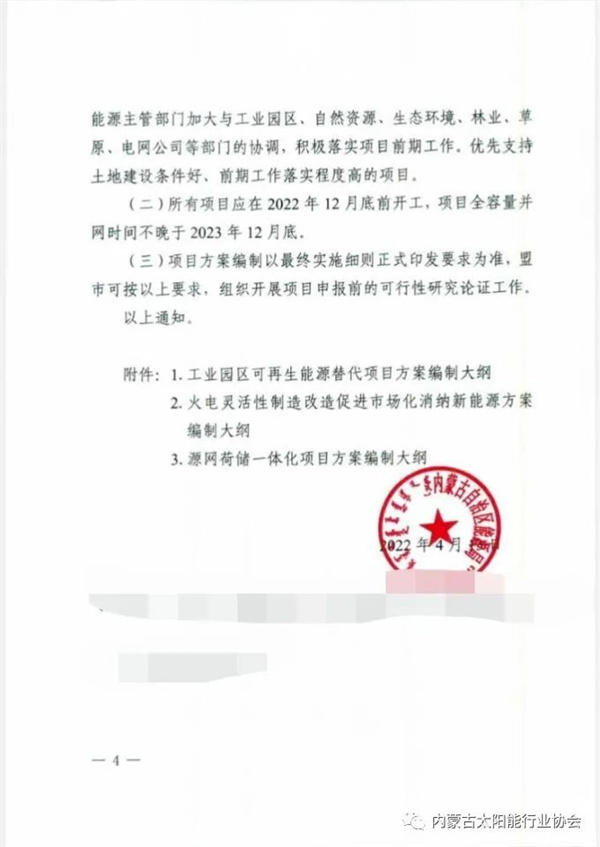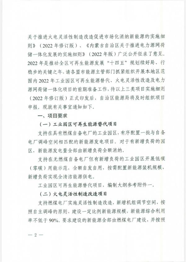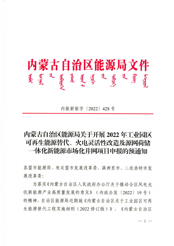 近日,內(nèi)蒙古自治區(qū)能源局印發(fā)《關(guān)于開展2022年工業(yè)園區(qū)可再生能源替代、火電靈活性改造及源網(wǎng)荷儲一體化新能源市場化并網(wǎng)項(xiàng)目申報(bào)的預(yù)通知》,待以上三類項(xiàng)目實(shí)施細(xì)則正式印發(fā)后啟動申報(bào)。 根據(jù)文件,可再生能源替代項(xiàng)目支持具有燃煤自備電廠的工業(yè)園區(qū)配置與自備電廠調(diào)峰空間相匹配的新能源項(xiàng)目;對于無燃煤自備電廠有新增負(fù)荷的,按需配置新能源裝機(jī)規(guī)模,新增負(fù)荷實(shí)現(xiàn)全清潔能源供電。 火電靈活性制造改造項(xiàng)目按照新增機(jī)組調(diào)節(jié)空間,建設(shè)一定比例新能源規(guī)模,但綜合利用率不低于90%,新能源全部由燃煤電廠建設(shè),按照一個法人統(tǒng)一管理。新能源建設(shè)規(guī)模應(yīng)與燃煤電廠新增調(diào)節(jié)能力相匹配,且滿足承擔(dān)的可再生能源電力消納責(zé)任權(quán)重。 電力源網(wǎng)荷儲一體化項(xiàng)目依托增量配電網(wǎng)建設(shè)的,同一個增量配電網(wǎng)只能有一個投資主體申報(bào)項(xiàng)目;要根據(jù)自主調(diào)峰、自我消納的原則,確定新能源規(guī)模和儲能配比,配建的儲能原則上不低于新能源規(guī)模的15%。 文件明確,項(xiàng)目場址不得占用永久基本農(nóng)田、不涉及生態(tài)保護(hù)紅線、國家公益林、自然保護(hù)區(qū)等禁止開發(fā)區(qū)域。優(yōu)先支持土地建設(shè)條件好、前期工作落實(shí)程度高的項(xiàng)目。所有項(xiàng)目應(yīng)在2022年12月底前開工,項(xiàng)目全容量并網(wǎng)時間不晚于2023年12月底。 全文如下: