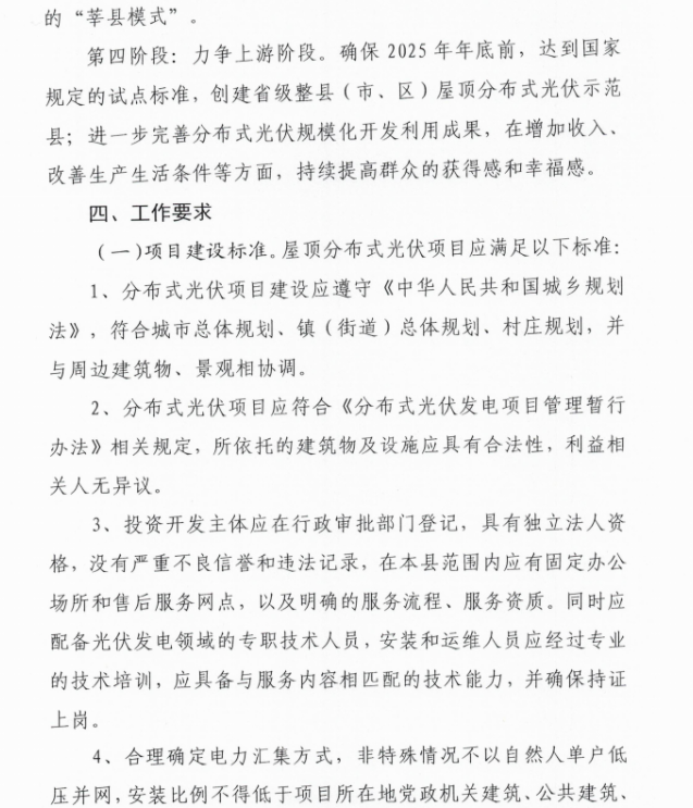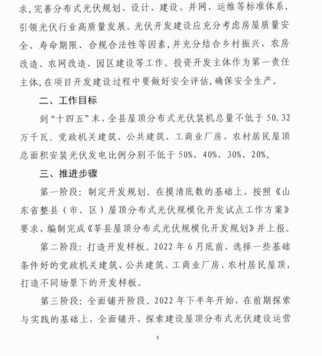 日前,山東聊城莘縣發(fā)布《莘縣整縣屋頂分布式光伏規(guī)?;_發(fā)實施方案》,方案指出,到“十四五”末,全縣屋頂分布式光伏裝機總量不低于50. 32萬千瓦。黨政機關(guān)建筑、公共建筑、工商業(yè)廠房、農(nóng)村居民屋頂總面積安裝光伏發(fā)電比例分別不低于50%、40%、30%、20%。 原文如下: