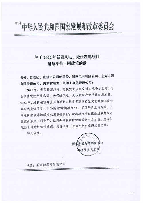 日前,國家發(fā)改委價格司下發(fā)《關(guān)于2022年新建風(fēng)電、光伏發(fā)電項目延續(xù)平價上網(wǎng)政策的函》,文件明確:2022年,對新核準(zhǔn)陸上風(fēng)電項目、新備案集中式光伏電站和工商業(yè)分布式光伏項目,延續(xù)平價上網(wǎng)政策,上網(wǎng)電價按當(dāng)?shù)厝济喊l(fā)電基準(zhǔn)價執(zhí)行;新建項目可自愿通過參與市場化交易形成上網(wǎng)電價,以充分體現(xiàn)新能源的綠色電力價值。鼓動各地出臺針對性扶持政策,支持風(fēng)電、光伏發(fā)電產(chǎn)業(yè)高質(zhì)量發(fā)展。