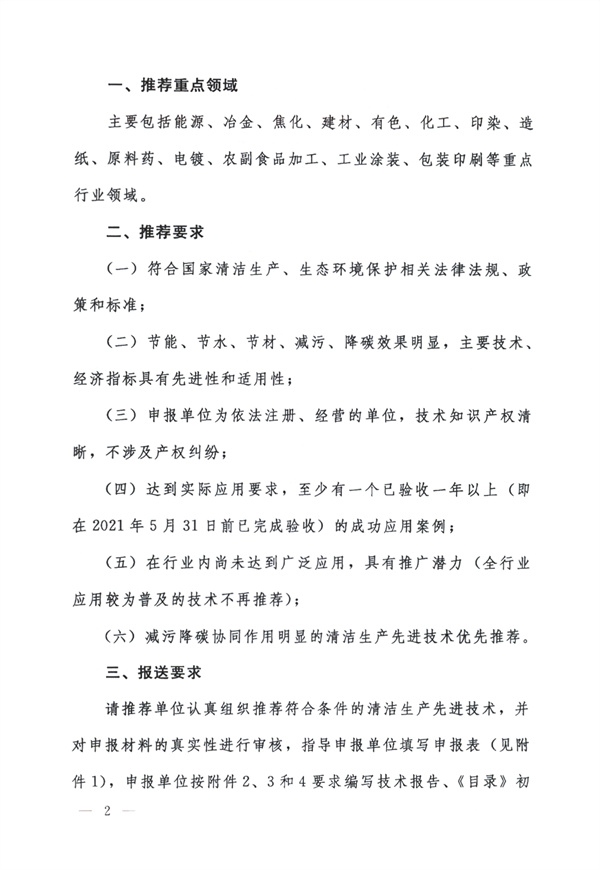 4月2日,生態(tài)環(huán)境部辦公廳、發(fā)展改革委辦公廳、工業(yè)和信息化部辦公廳聯(lián)合印發(fā)《關(guān)于推薦清潔生產(chǎn)先進(jìn)技術(shù)的通知》,技術(shù)推薦重點(diǎn)領(lǐng)域主要包括能源、冶金、焦化、建材、有色、化工、印染、造紙、原料藥、電鍍、農(nóng)副食品加工、工業(yè)涂裝、包裝印刷等重點(diǎn)行業(yè)領(lǐng)域。 推薦要求: (一)符合國(guó)家清潔生產(chǎn)、生態(tài)環(huán)境保護(hù)相關(guān)法律法規(guī)、政策和標(biāo)準(zhǔn); (二)節(jié)能、節(jié)水、節(jié)材、減污、降碳效果明顯,主要技術(shù)、經(jīng)濟(jì)指標(biāo)具有先進(jìn)性和適用性; (三)申報(bào)單位為依法注冊(cè)、經(jīng)營(yíng)的單位,技術(shù)知識(shí)產(chǎn)權(quán)清晰,不涉及產(chǎn)權(quán)糾紛; (四)達(dá)到實(shí)際應(yīng)用要求,至少有一個(gè)已驗(yàn)收一年以上(即在2021年5月31日前已完成驗(yàn)收)的成功應(yīng)用案例; (五)在行業(yè)內(nèi)尚未達(dá)到廣泛應(yīng)用,具有推廣潛力(全行業(yè)應(yīng)用較為普及的技術(shù)不再推薦); (六)減污降碳協(xié)同作用明顯的清潔生產(chǎn)先進(jìn)技術(shù)優(yōu)先推薦。 全文如下: