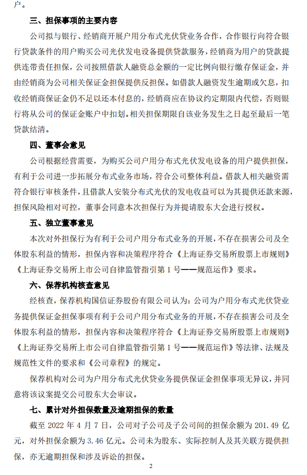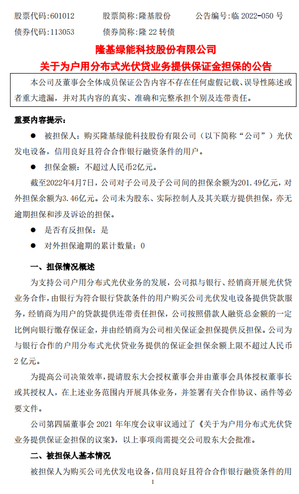 隆基股份關(guān)于為戶用分布式光伏貸業(yè)務(wù)提供保證金擔(dān)保的公告2022-04-28 14:47瀏覽數(shù):3次