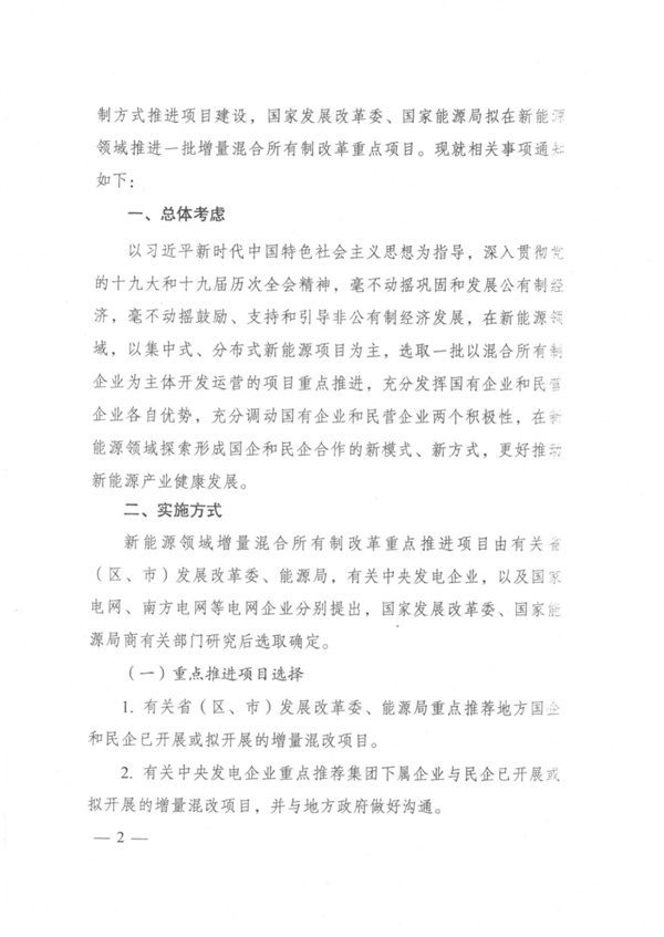 近日,國家發(fā)展改革委辦公廳、國家能源局綜合司聯(lián)合下發(fā)《關于做好新能源領域增量混合所有制改革重點推進項目工作的通知》,文件提出:充分發(fā)揮國有企業(yè)、民營企業(yè)在新能源領域的各自優(yōu)勢,鼓勵以合作新設市場主體等增量混合所有制方式推進項目建設,國家發(fā)展改革委、國家能源局擬在新能源領域推進一批增量混合所有制改革重點項目。 文件明確,新能源領域?qū)⒁约惺健⒎植际叫履茉错椖繛橹?,選取一批以混合所有制企業(yè)為主體開發(fā)運營的重點項目,充分發(fā)揮國企和民企的各自優(yōu)勢,并調(diào)動其積極性,在新能源領域探索形成國企和民企合作的新模式、新方式以推動新能源產(chǎn)業(yè)健康發(fā)展,從而為新能源發(fā)展培育更多合格的市場主體和有生力量。 將聚焦于三類重點項目: 1.有關省(區(qū)、市)發(fā)展改革委、能源局重點推薦地方國企和民企已開展或擬開展的增量混改項目。 2.有關中央發(fā)電企業(yè)重點推薦集團下屬企業(yè)與民企已開展或擬開展的增量混改項目,并與地方政府做好溝通。 3.國家電網(wǎng)、南方電網(wǎng)可在新能源接網(wǎng)消納等領域,推薦與民企已開展或擬開展的增量混改項目。 全文如下: