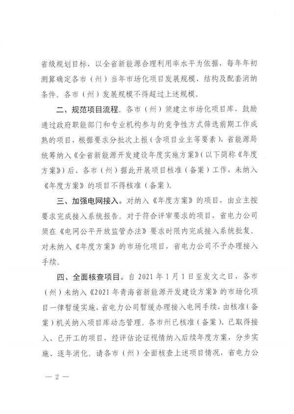 4月29日,青海省能源局印發(fā)《關(guān)于進一步加強新能源市場化并網(wǎng)管項目管理的通知》。文件稱,各市州核準備案的市場化并網(wǎng)規(guī)模急劇增長,嚴重超出我省新能源消納空間,將嚴重影響我省新能源利用率。 為進一步強化市場化項目管理,明確省能源局會同省電力公司根據(jù)國家部署、省級規(guī)劃目標,以全省新能源合理利用率水平為依據(jù),每年年初測算確定各市州當(dāng)年市場化項目發(fā)展規(guī)模、結(jié)構(gòu)及配套消納條件,各市州發(fā)展規(guī)模不得超過上述規(guī)模。 同時,文件還進一步規(guī)范了項目流程,全面核查項目。自2021年1月1日至發(fā)文之日,各市州未納入《2021年青海省新能源開發(fā)建設(shè)方案》的市場化項目一律暫緩實施,省電力公司暫緩辦理接入電網(wǎng)手續(xù),由核準機關(guān)納入項目庫動態(tài)管理。各市州已核準、已取得接入、已開工項目,經(jīng)評估論證視情況納入后續(xù)年度方案,分步實施、逐年消化。