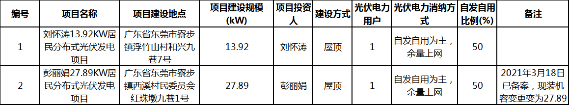 關(guān)于寮步鎮(zhèn)(園區(qū))居民分布式光伏項目備案的復(fù)函 寮步鎮(zhèn)供電服務(wù)中心: 報來《劉懷濤共1戶居民家庭分布式光伏項目備案資料的函》及相關(guān)材料,另2021年3月22日備案彭麗娟原裝機(jī)容量為17.76KW現(xiàn)變更為27.89KW的資料收悉,經(jīng)研究,同意上述居民光伏項目備案申請(清單見附件)。 請根據(jù)《東莞市發(fā)展和改革局分布式光伏發(fā)電項目建設(shè)管理暫行管理辦法》(東發(fā)改[2017]770號)要求,開展下一階段工作。 專此函復(fù) 東莞市發(fā)展和改革局 2022年4月29日 東莞市個人住宅分布式光伏項目明細(xì)表