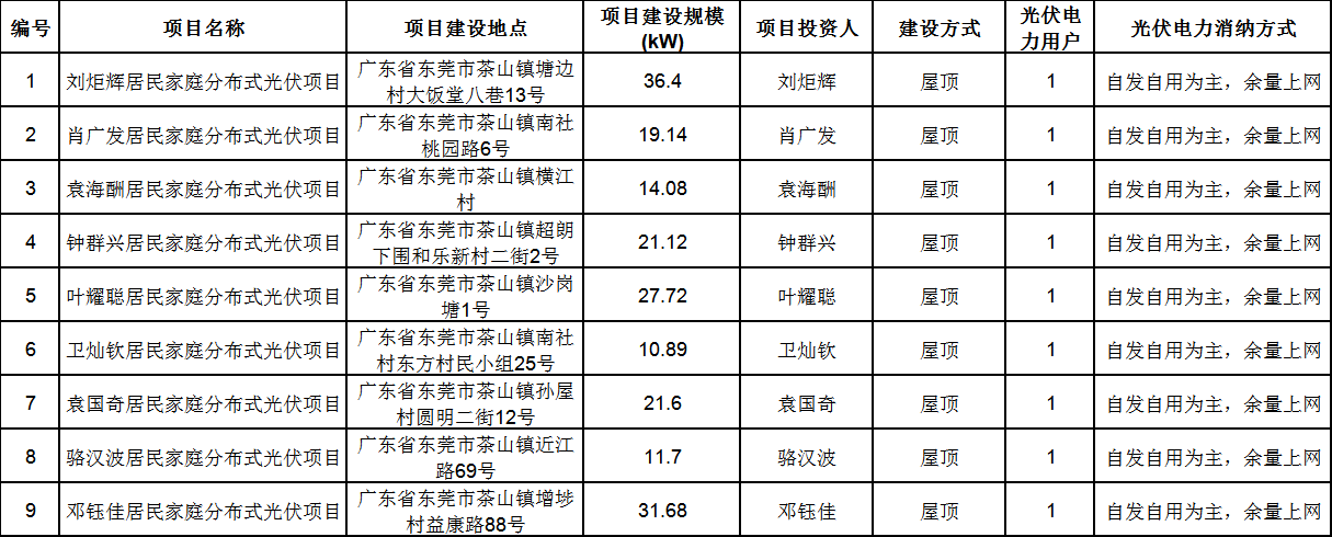 5月5日,廣東省東莞市茶山鎮(zhèn)人民政府、寮步鎮(zhèn)人民政府分別發(fā)布居民分布式光伏項目備案的復(fù)函,共包含11個分布式光伏項目,總裝機(jī)規(guī)模236.14kW,其中茶山鎮(zhèn)194.33kW、寮步鎮(zhèn)41.81kW。 詳情如下: 關(guān)于同意茶山鎮(zhèn)居民分布式光伏項目備案的復(fù)函(3月2日~4月24日) 茶山鎮(zhèn)供電服務(wù)中心: 報來《關(guān)于報送茶山鎮(zhèn)居民分布式光伏項目備案資料的函》及相關(guān)材料收悉。經(jīng)研究,同意劉炬輝、肖廣發(fā)等9戶居民家庭分布式光伏項目備案申請(清單見附件)。 請根據(jù)《東莞市發(fā)展和改革局分布式光伏發(fā)電項目建設(shè)管理暫行管理辦法》(東發(fā)改〔2017〕770號)要求,開展下一階段工作。 專此函復(fù) 附件:東莞市個人住宅分布式光伏項目明細(xì)表 東莞市發(fā)展和改革局 2022年4月24日 (聯(lián)系人:茶山鎮(zhèn)經(jīng)濟(jì)發(fā)展局葉鋒翹 聯(lián)系電話:86640591) 附件: 東莞市個人住宅分布式光伏項目明細(xì)表