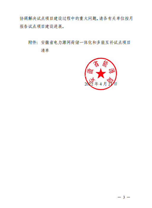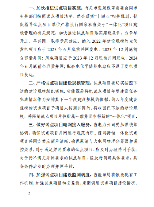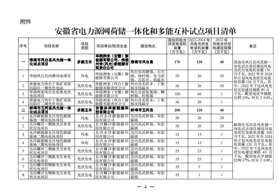 近日,安徽省能源局印發(fā)《安徽省電力源網(wǎng)荷儲一體化和多能互補試點項目清單》,將淮南市鳳臺縣風光儲一體化項目等4個項目作為“一體化”試點項目(以下簡稱試點項目)。 文件要求,納入2022年建設(shè)規(guī)模的光伏發(fā)電項目應(yīng)于2023年6月底前并網(wǎng)發(fā)電,2023年12月底前全容量并網(wǎng);風電項目應(yīng)于2023年12月底前并網(wǎng)發(fā)電,2024年6月底前全容量并網(wǎng);配套電化學(xué)儲能電站應(yīng)不遲于發(fā)電項目投運。