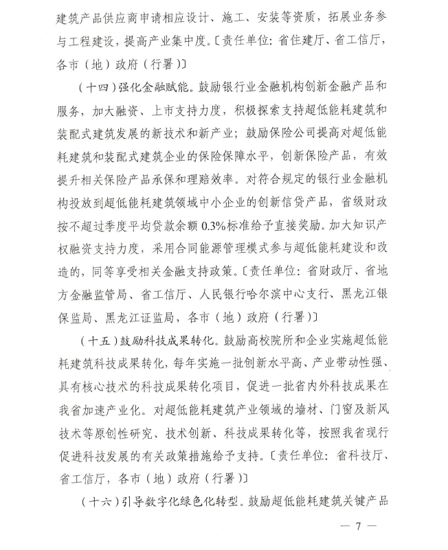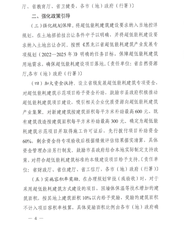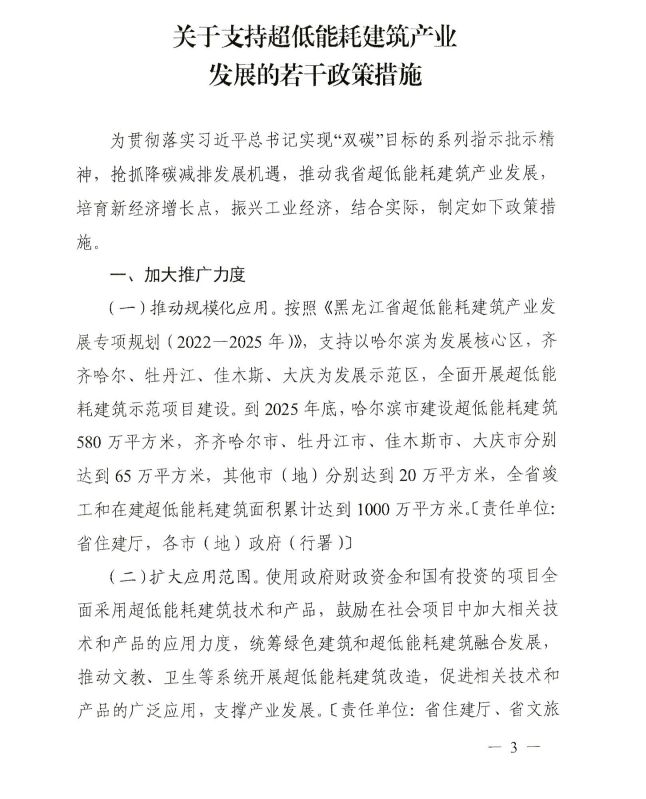 日前,黑龍江省工業(yè)和信息化廳發(fā)布關(guān)于支持超低能耗建筑產(chǎn)業(yè)發(fā)展的若干政策措施,其中提到,支持以哈爾濱為發(fā)展核心區(qū),齊齊哈爾、牡丹江、佳木斯、大慶為發(fā)展示范區(qū),全面開展超低能耗建筑示范項目建設(shè)。到2025年底,哈爾濱市建設(shè)超低能耗建筑580萬平方米,齊齊哈爾市、牡丹江市、佳木斯市、大慶市分別達到65萬平方米,其他市(地)分別達到20萬平方米,全省竣工和在建超低能耗建筑面積累計達到1000萬平方米。 設(shè)立省級發(fā)展超低能耗建筑專項資金,對超低能耗建筑示范項目給予資金補助,鼓勵市縣政府積極推動超低能耗建筑項目建設(shè),吸引相關(guān)企業(yè)優(yōu)質(zhì)資源向超低能耗建筑產(chǎn)業(yè)集聚。對新建建筑按建筑面積每平方米補助最高600元、既有建筑改造按建筑面積每平方米補助最高300元。確定為超低能耗建筑示范項目并取得施工許可證后,先行撥付項目補助資金60%,剩余資金待專項驗收后根據(jù)績效評估結(jié)果據(jù)實清算,具體資金管理辦法另行制發(fā)。鼓勵市縣政府結(jié)合本地實際制定支持政策,對符合超低能耗建筑標(biāo)準(zhǔn)的本級建設(shè)項目給予支持。 原文如下: