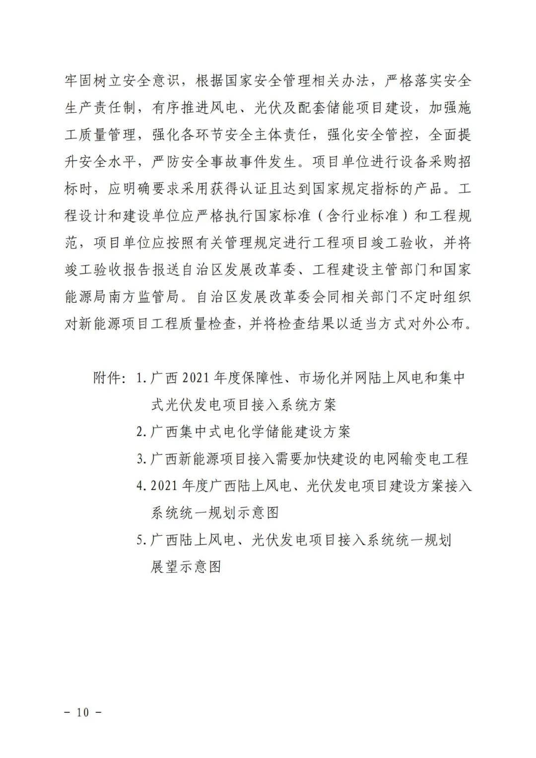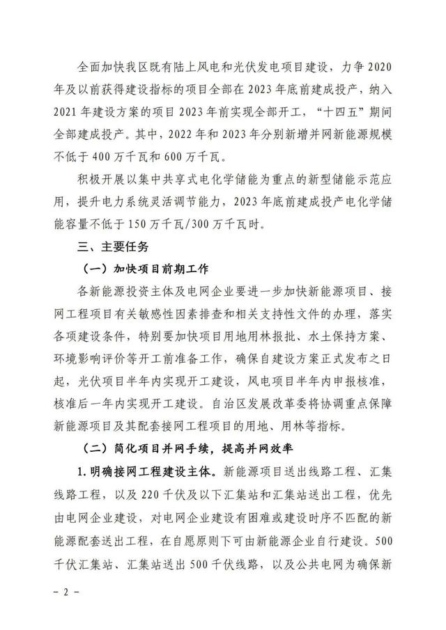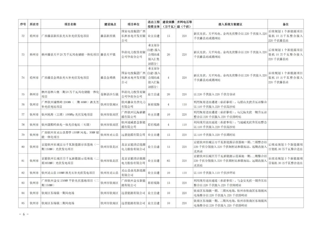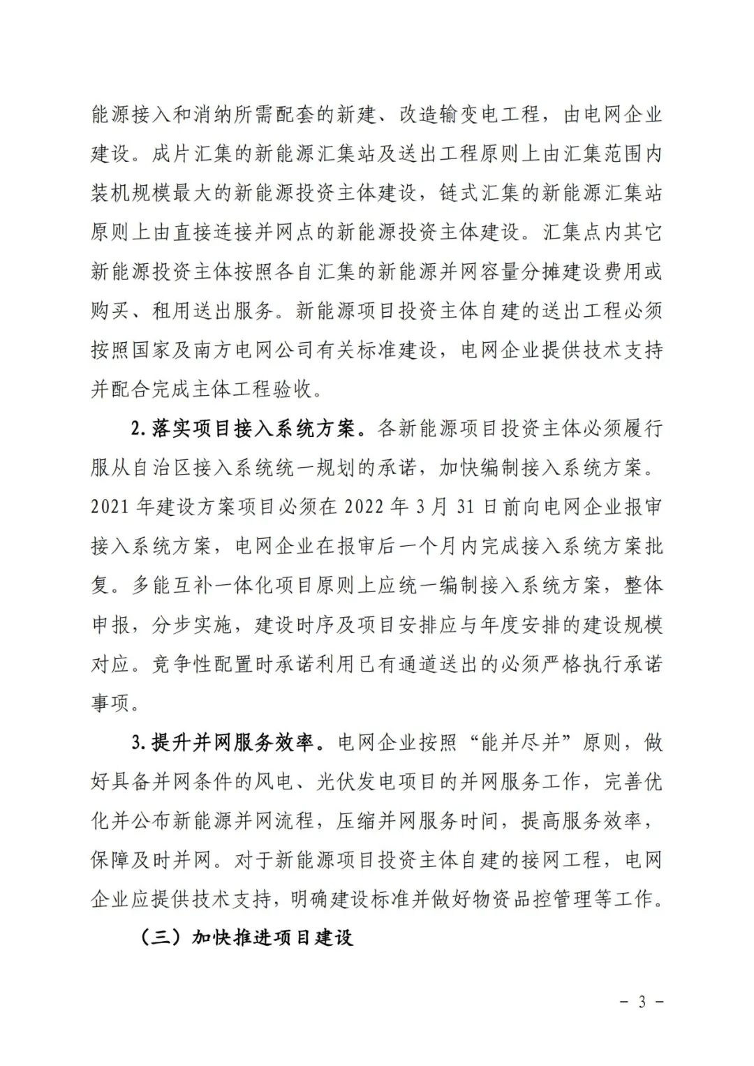方案要求:全面加快廣西區(qū)既有陸上風電和光伏發(fā)電項目建設(shè),力爭2020年及以前獲得建設(shè)指標的項目全部在2023年底前建成投產(chǎn),納入2021年建設(shè)方案的項目2023年前實現(xiàn)全部開工,“十四五”期間全部建成投產(chǎn)。其中,2022年和2023年分別新增并網(wǎng)新能源規(guī)模不低于400萬千瓦和600萬千瓦。