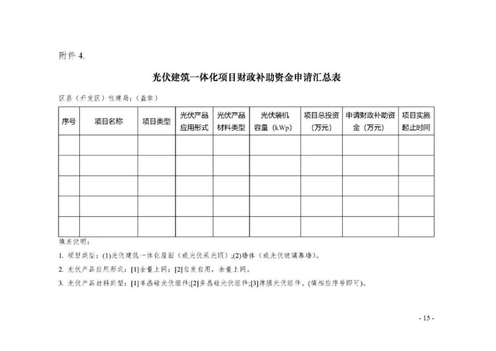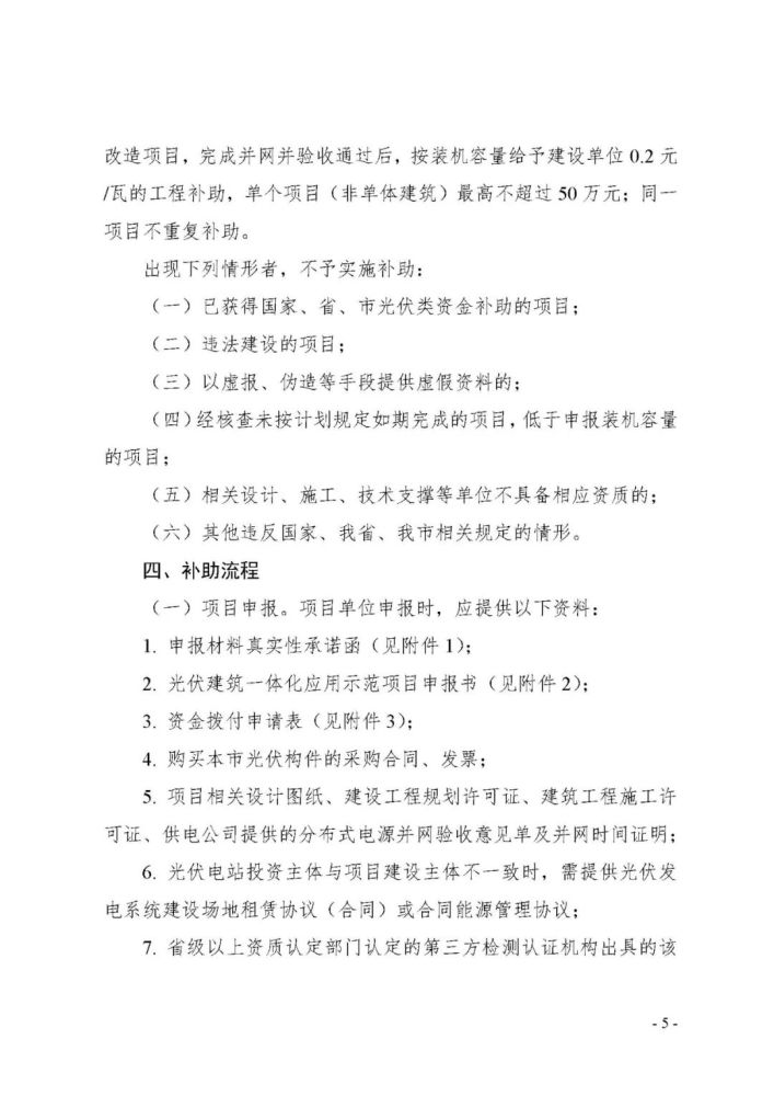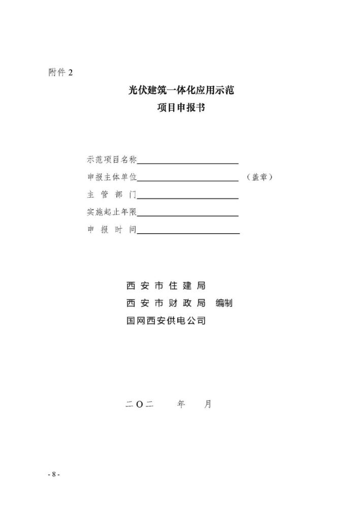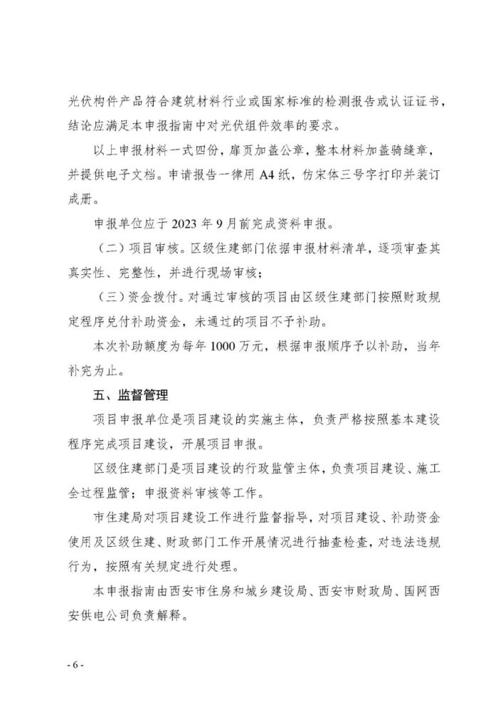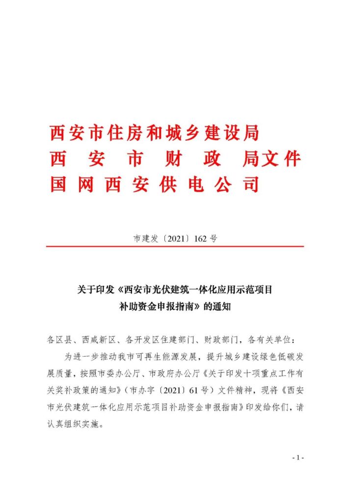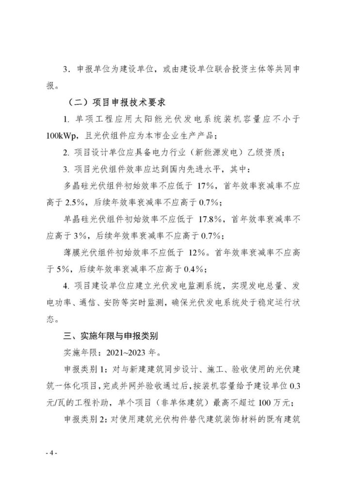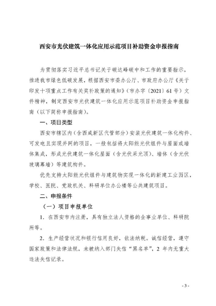 西安市:最高0.3元/瓦 不超過100萬元11月23日,西安市住房和城鄉(xiāng)建設(shè)局,西安市財政局,國網(wǎng)西安供電公司印發(fā)了《西安市光伏建筑一體化應(yīng)用示范項目補(bǔ)助資金申報指南》的通知。實施年限為2021~2023年。 項目類型為西安市轄區(qū)內(nèi)(含西咸新區(qū)代管部分)安裝光伏建筑一體化構(gòu)件、可發(fā)電且實現(xiàn)并網(wǎng)的項目,一般包括將太陽能光伏組件與屋面或墻體集成,形成光伏建筑一體化屋面(含光伏采光頂)、墻體(含光伏玻璃幕墻)等建筑構(gòu)件。 優(yōu)先支持太陽能光伏組件與建筑物實現(xiàn)一體化的新建工業(yè)園區(qū),學(xué)校、醫(yī)院、黨政機(jī)關(guān)、科研單位辦公樓等公共建筑項目。 對與新建建筑同步設(shè)計、施工、驗收使用的光伏建筑一體化項目,完成并網(wǎng)并驗收通過后,按裝機(jī)容量給予建設(shè)單位0.3元/瓦的工程補(bǔ)助,單個項目(非單體建筑)最高不超過100萬元; 對使用建筑光伏構(gòu)件替代建筑裝飾材料的既有建筑改造項目,完成并網(wǎng)并驗收通過后,按裝機(jī)容量給予建設(shè)單位0.2元/瓦的工程補(bǔ)助,單個項目(非單體建筑)最高不超過50萬元;同一項目不重復(fù)補(bǔ)助。本次補(bǔ)助額度為每年1000萬元,根據(jù)申報順序予以補(bǔ)助,當(dāng)年補(bǔ)完為止。 此外,要求項目申報技術(shù)為單項工程應(yīng)用太陽能光伏發(fā)電系統(tǒng)裝機(jī)容量應(yīng)不小于100kWp,且光伏組件應(yīng)為本市企業(yè)生產(chǎn)產(chǎn)品。其中,項目光伏組件效率應(yīng)達(dá)到國內(nèi)先進(jìn)水平。 l 多晶硅光伏組件初始效率不應(yīng)低于17%,首年效率衰減率不應(yīng)高于2.5%,后續(xù)年效率衰減率不應(yīng)高于0.7%; l 單晶硅光伏組件初始效率不應(yīng)低于17.8%,首年效率衰減率不應(yīng)高于3%,后續(xù)年效率衰減率不應(yīng)高于0.7%; l 薄膜光伏組件初始效率不應(yīng)低于12%。首年效率衰減率不應(yīng)高于5%,后續(xù)年效率衰減率不應(yīng)高于0.4%。