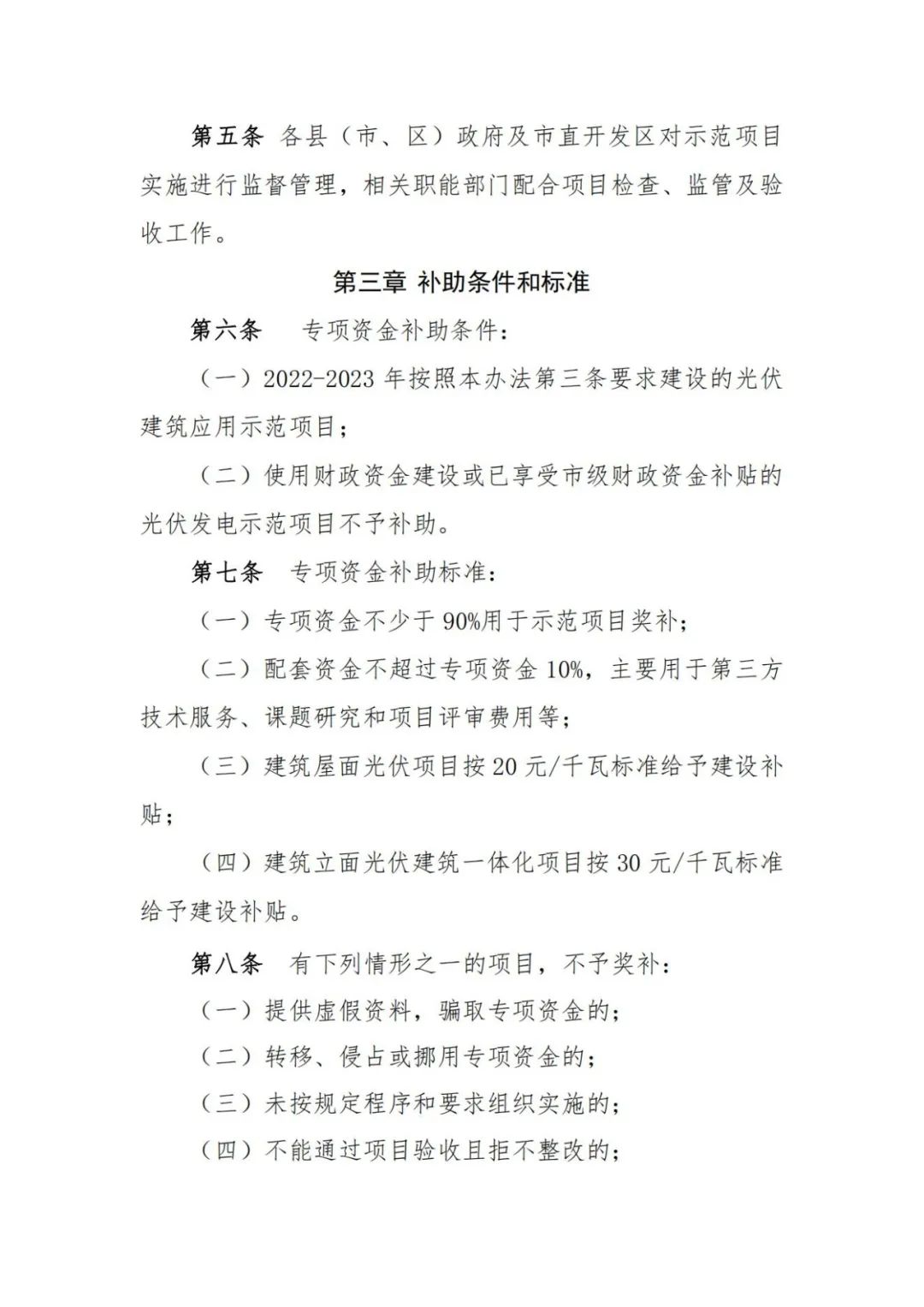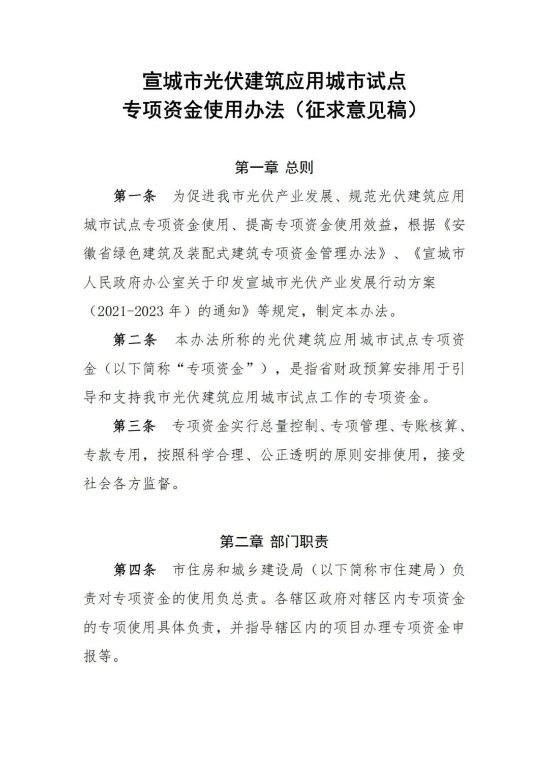 安徽宣城:立面BIPV補(bǔ)貼30元/千瓦,屋面光伏20元/千瓦3月31日,安徽省宣城住建局官網(wǎng)發(fā)布《宣城市光伏建筑應(yīng)用城市試點專項資金使用辦法》(征求意見稿)。 意見稿明確,專項資金補(bǔ)助條件為: (一)2022-2023 年按照本辦法第三條要求建設(shè)的光伏建筑應(yīng)用示范項目; (二)使用財政資金建設(shè)或已享受市級財政資金補(bǔ)貼的光伏發(fā)電示范項目不予補(bǔ)助。 專項資金補(bǔ)助標(biāo)準(zhǔn)為: (一)專項資金不少于90%用于示范項目獎補(bǔ); (二)配套資金不超過專項資金10%,主要用于第三方技術(shù)服務(wù)、課題研究和項目評審費用等; (三)建筑屋面光伏項目按20元/千瓦標(biāo)準(zhǔn)給予建設(shè)補(bǔ)貼; (四)建筑立面光伏建筑一體化項目按30元/千瓦標(biāo)準(zhǔn)給予建設(shè)補(bǔ)貼。 此外,意見稿指出,有下列情形之一的項目,不予獎補(bǔ): (一)提供虛假資料,騙取專項資金的; (二)轉(zhuǎn)移、侵占或挪用專項資金的; (三)未按規(guī)定程序和要求組織實施的; (四)不能通過項目驗收且拒不整改的; (五)超過承諾竣工時間且到2023年12月底仍未竣工的; (六)不符合國家、省和市其他相關(guān)規(guī)定的。 原文如下: ![]() ![]() ![]() ![]()