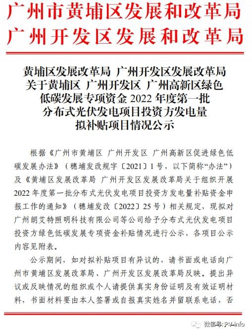 廣州黃埔區(qū)公示第一批分布式光伏補貼:公共機構0.3元/千瓦時,非公共機構0.15元/千瓦4月11日,黃埔區(qū)發(fā)展改革局 廣州開發(fā)區(qū)發(fā)展改革局發(fā)布廣州高新區(qū)綠色低碳發(fā)展專項資金2022年度第一批分布式光伏發(fā)電項目投資方發(fā)電量擬補貼項目情況公示,公示時間4月11-4月15日。文件指出,對分布式光伏發(fā)電的項目投資方按照發(fā)電量給予補貼,補貼標準為0.15元/千瓦時[應用方(屋頂方)為非公共機構的]、0.3元/千瓦時[應用方(屋頂方)為公共機構的]。單個項目最高享受補貼時間為5年,補貼時間范圍在本辦法有效期內。由項目投資方于項目并網后在線持續(xù)運行6個月以上后提出申請。 原文如下: