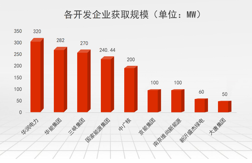 2021年5月11日,江蘇發(fā)改委公布《2022年光伏發(fā)電市場(chǎng)化并網(wǎng)項(xiàng)目(第一批)名單的通知》,名單按照《省發(fā)展改革委關(guān)于開(kāi)展2022年光伏發(fā)電市場(chǎng)化并網(wǎng)項(xiàng)目開(kāi)發(fā)建設(shè)工作的通知》(蘇發(fā)改能源發(fā)〔2022〕350號(hào))有關(guān)要求,經(jīng)項(xiàng)目投資主體申報(bào),項(xiàng)目所屬縣(市、區(qū))、設(shè)區(qū)市投資主管部門初審,省發(fā)展改革委(能源局)復(fù)核。 第一批市場(chǎng)化項(xiàng)目共計(jì)18個(gè),共計(jì)1622.44MW。 開(kāi)發(fā)企業(yè)分別有華潤(rùn)電力、華能集團(tuán)、三峽集團(tuán)、國(guó)家能源集團(tuán)、中廣核、京能集團(tuán)、南京維尚新能源、新沂盛杰綠電、大唐集團(tuán)。 獲取規(guī)模與項(xiàng)目詳情如下: