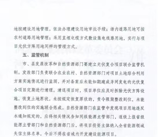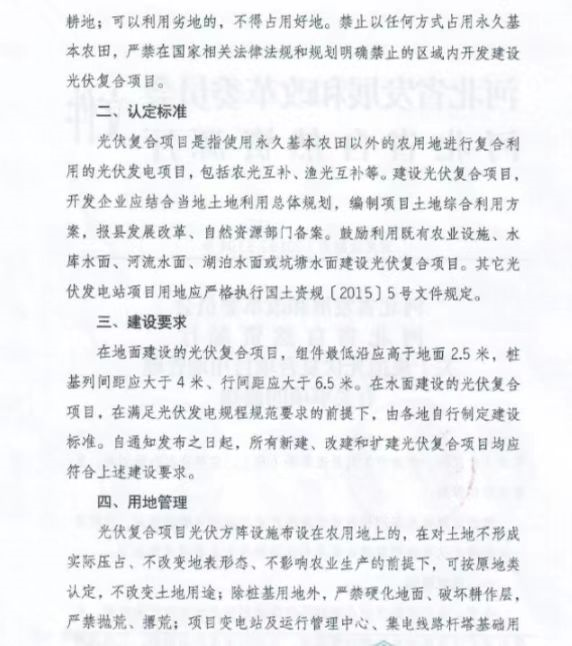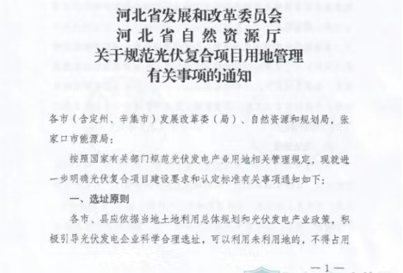 2022年5月11日,河北省發(fā)改委、河北省自然資源廳聯(lián)合發(fā)布《關(guān)于進(jìn)一步明確存量光伏復(fù)合項(xiàng)目占用耕地政策的通知》。 文件要求對(duì)未形成工程實(shí)際占用的存量光伏復(fù)合項(xiàng)目,不得占用耕地;已形成實(shí)際占用耕地的,市縣有關(guān)部門(mén)加強(qiáng)事中事后監(jiān)管,確保項(xiàng)目以農(nóng)為主、光伏為輔,農(nóng)業(yè)與光伏產(chǎn)業(yè)互補(bǔ)共贏,同時(shí)不對(duì)土地形成實(shí)際壓占、不改變地表形態(tài)、不影響農(nóng)業(yè)生產(chǎn),嚴(yán)禁“只有光、沒(méi)有農(nóng)、未互補(bǔ)”。 工程實(shí)際占用耕地是指2022年1月17日之前,光伏方陣設(shè)施已鋪設(shè)完成。 就已形成實(shí)際工程占用、但未完成項(xiàng)目用地審批的存量光伏復(fù)合項(xiàng)目,對(duì)照新明確的政策邊界分別就項(xiàng)目建設(shè)規(guī)模與批復(fù)是否一致、已形成實(shí)際占用耕地?cái)?shù)量開(kāi)展核查,建立項(xiàng)目臺(tái)賬,作為后續(xù)項(xiàng)目建設(shè)管理以及土地預(yù)審、建設(shè)用地審批等用地手續(xù)辦理的重要依據(jù)。 受上述政策影響,不具備建設(shè)條件的項(xiàng)目,由市級(jí)能源主管部門(mén)牽頭,提出項(xiàng)目建設(shè)地點(diǎn)、建設(shè)規(guī)模及建設(shè)時(shí)限調(diào)整意見(jiàn),于6月15日前將請(qǐng)示文件、項(xiàng)目調(diào)整統(tǒng)計(jì)表、市級(jí)自然資源部門(mén)新選址用地意見(jiàn)及拐點(diǎn)坐標(biāo)文件(kml格式)報(bào)送省發(fā)展改革委。 無(wú)法調(diào)整的應(yīng)申請(qǐng)取消建設(shè)計(jì)劃,相應(yīng)建設(shè)規(guī)模納入本市2022年項(xiàng)目申報(bào)范圍統(tǒng)籌考慮。 其中,2020年前已批復(fù)、按全容量并網(wǎng)項(xiàng)目可申請(qǐng)調(diào)減規(guī)?;蛉∠?jì)劃,不得申請(qǐng)調(diào)整建設(shè)地點(diǎn)和建設(shè)時(shí)限。 此前,河北曾發(fā)布《河北省發(fā)展和改革委員會(huì)河北省自然資源廳關(guān)于規(guī)范光伏復(fù)合項(xiàng)目用地管理有關(guān)事項(xiàng)的通知》,對(duì)農(nóng)光互補(bǔ)光伏項(xiàng)目進(jìn)行了規(guī)范!
