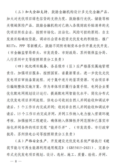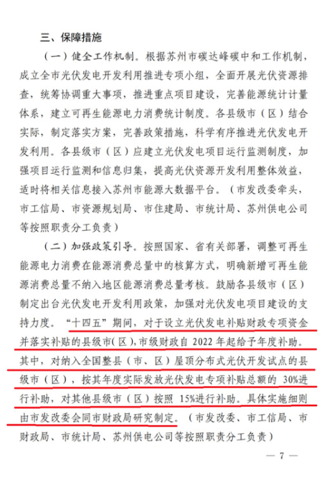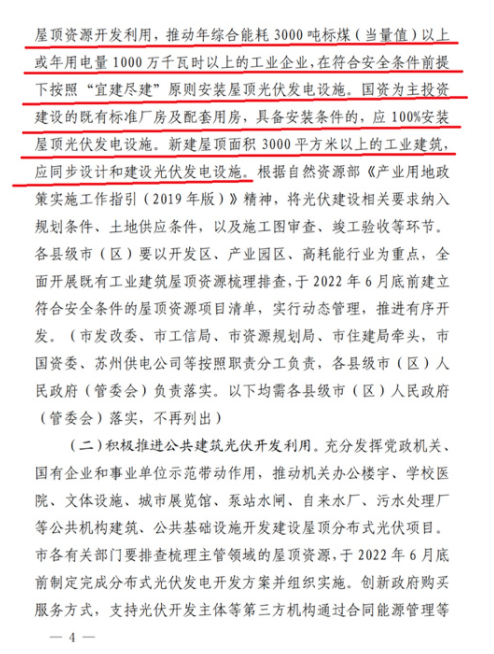 為加快推進全市光伏發(fā)電開發(fā)利用,落實國家能源安全戰(zhàn)略,聚焦碳達峰、碳中和目標(biāo)任務(wù),江蘇省蘇州市政府辦公室印發(fā)關(guān)于加快推進全市光伏發(fā)電開發(fā)利用的工作意見。 到2025年底,全市確保新增光伏裝機并網(wǎng)容量2GW,力爭達到新增3GW。 意見指出: 1、關(guān)于國企:國資為主標(biāo)準廠房100%安裝; 2、機關(guān)單位:黨政機關(guān)、文體設(shè)施、學(xué)校醫(yī)院等梳理排查“宜建盡建”; 3、工業(yè)企業(yè):年用電1000萬千瓦時以上的工業(yè)企業(yè)“宜建盡建”; 4、商業(yè)企業(yè):年用電500萬千瓦時以上的商業(yè)企業(yè)“宜建盡建”; 5、新建廠房:新建3000平米以上的工業(yè)建筑需同步設(shè)計安裝; 6、重點梳理排查開發(fā)區(qū)、產(chǎn)業(yè)園區(qū)、高耗能企業(yè),并有序開發(fā); 7、簡化分布式光伏發(fā)電項目并網(wǎng)流程“能并盡并”。 “十四五”期間,對設(shè)立光伏發(fā)電補貼財政專項資金落實補貼的縣級市(區(qū)),市級財政自2022年起給予年度補助,其中,對納入全國整縣(市、區(qū))屋頂分布式光伏開發(fā)試點的縣級市(區(qū))按其年度實際發(fā)放光伏發(fā)電專項補貼總額的30%進行補助,對其他縣級市(區(qū))按照15%進行補助。