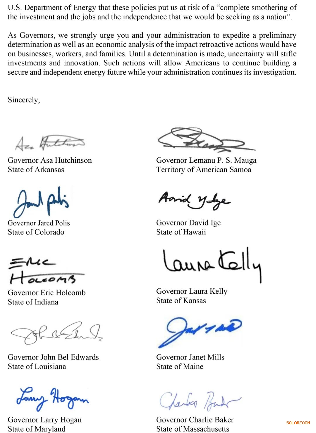 周二,一個由19名美國州長組成的兩黨小組向總統(tǒng)喬·拜登(Joe Biden)和吉娜·雷蒙多(Gina Raimondo)施壓,要求他們迅速結(jié)束針對東南亞進(jìn)口光伏反傾銷規(guī)避調(diào)查(AD / CVD)。 該19個州占美國總?cè)丝诘?3%,他們在聯(lián)名信中表示,在該調(diào)查開始后,由于太陽能產(chǎn)品進(jìn)口的急劇下降,美國太陽能行業(yè)迅速惡化,威脅到全國成千上萬的清潔能源工作崗位和太陽能項目的部署,美國多個項目不得不中斷,超過23萬工作崗位受到威脅。 對此,太陽能行業(yè)協(xié)會(SEIA)主席兼首席執(zhí)行官Abigail Ross Hopper也發(fā)表聲明指出,這封聯(lián)名信強調(diào)了商務(wù)部的關(guān)稅調(diào)查對各州經(jīng)濟(jì),電網(wǎng)和當(dāng)?shù)貏趧恿Φ钠茐?,多年來,盡管聯(lián)邦政府應(yīng)對氣候變化的工作停滯不前,但各州在清潔能源方面工作上一直做的很優(yōu)秀,而如今,拜登政府現(xiàn)在正在阻礙各州的清潔能源目標(biāo)。 該案件每拖延一天,拜登總統(tǒng)的清潔能源經(jīng)濟(jì)的目標(biāo)就更加遙遠(yuǎn),我們敦促商務(wù)部盡快發(fā)布否定的初步?jīng)Q定。 原文如下: