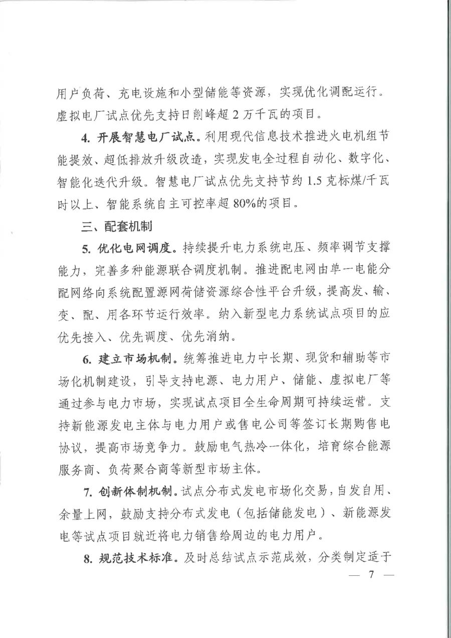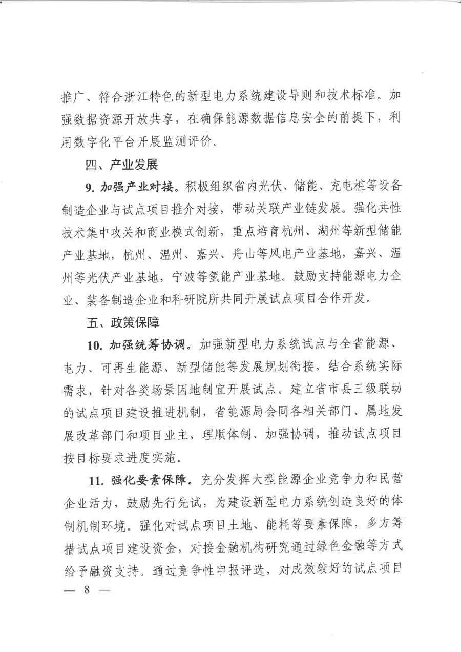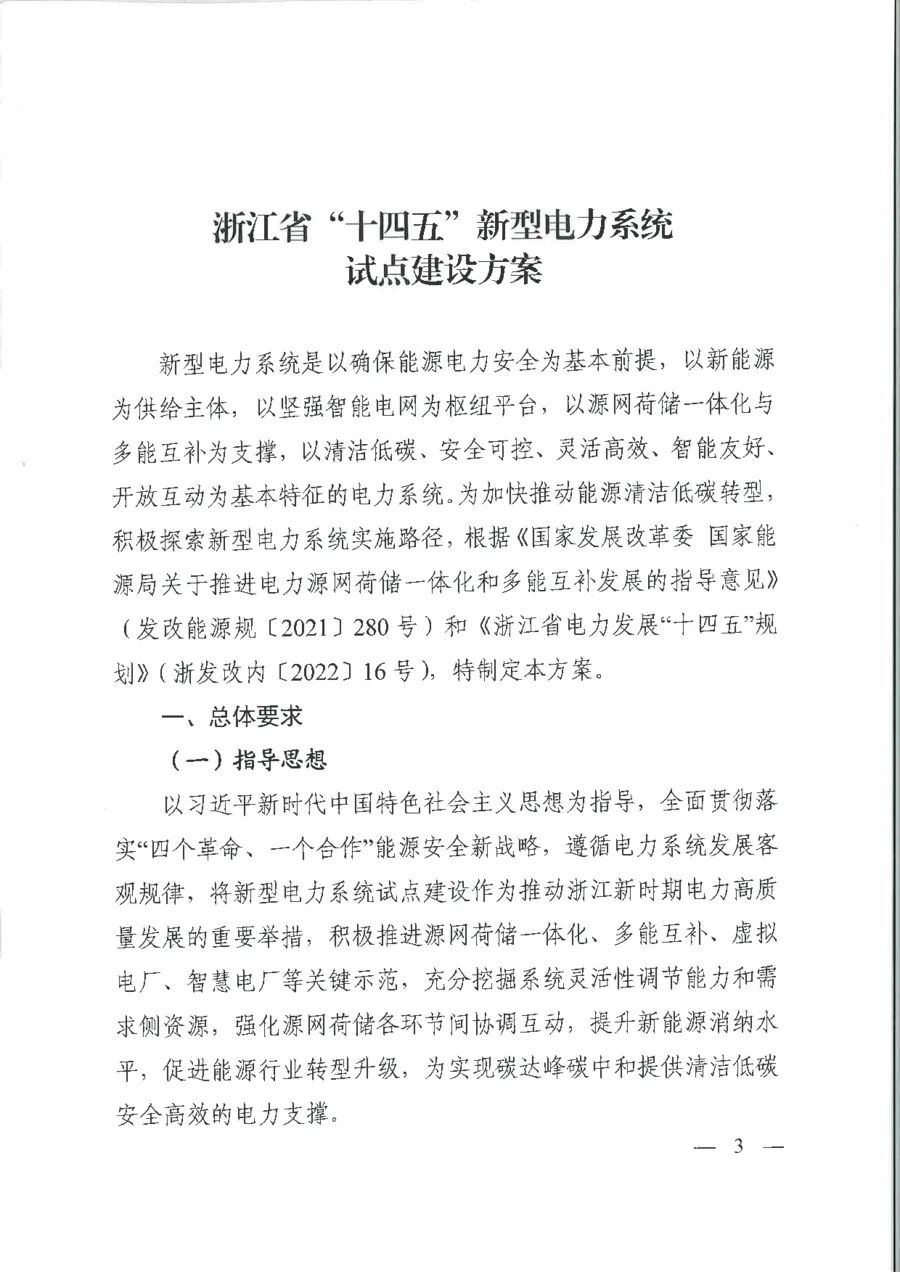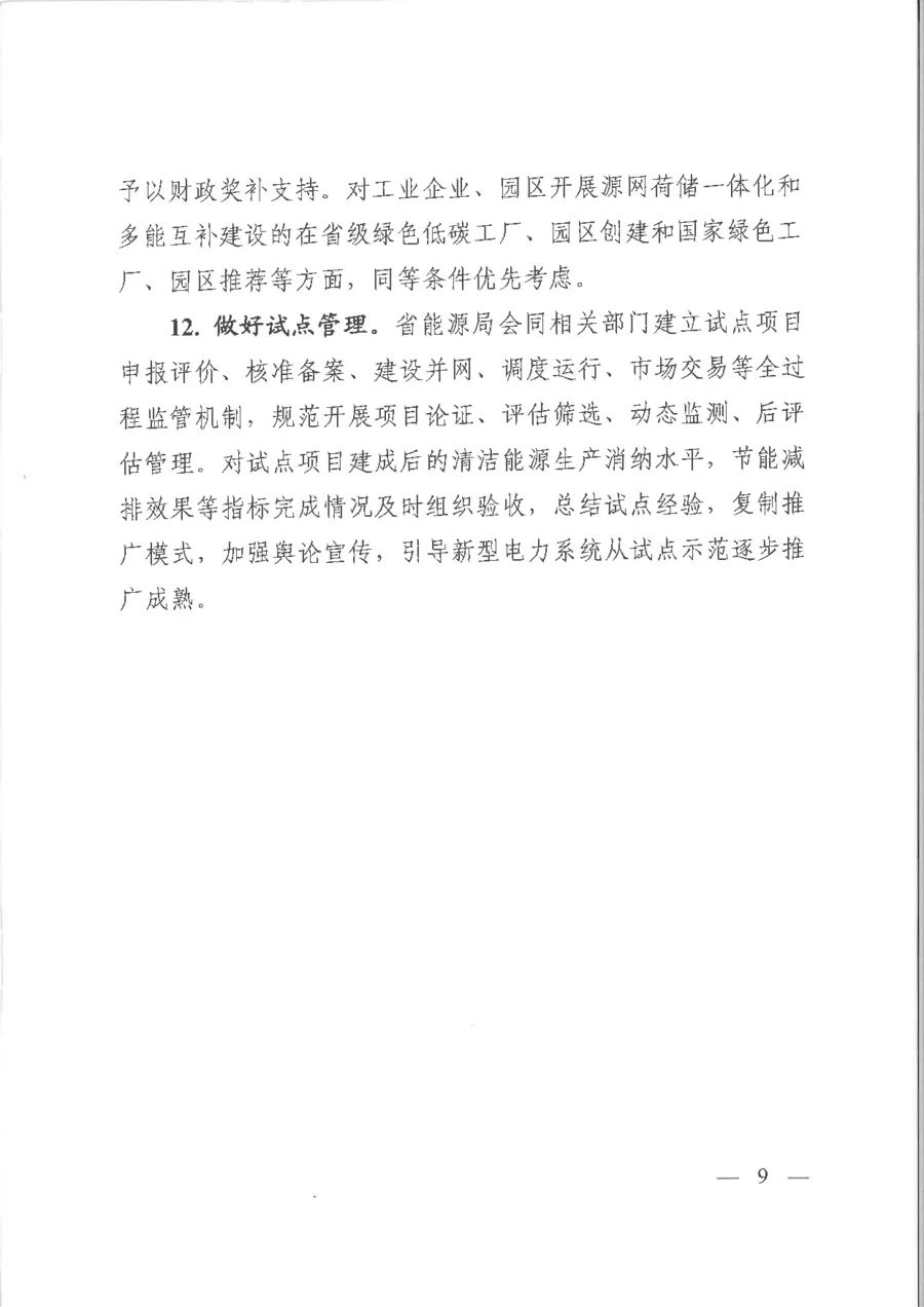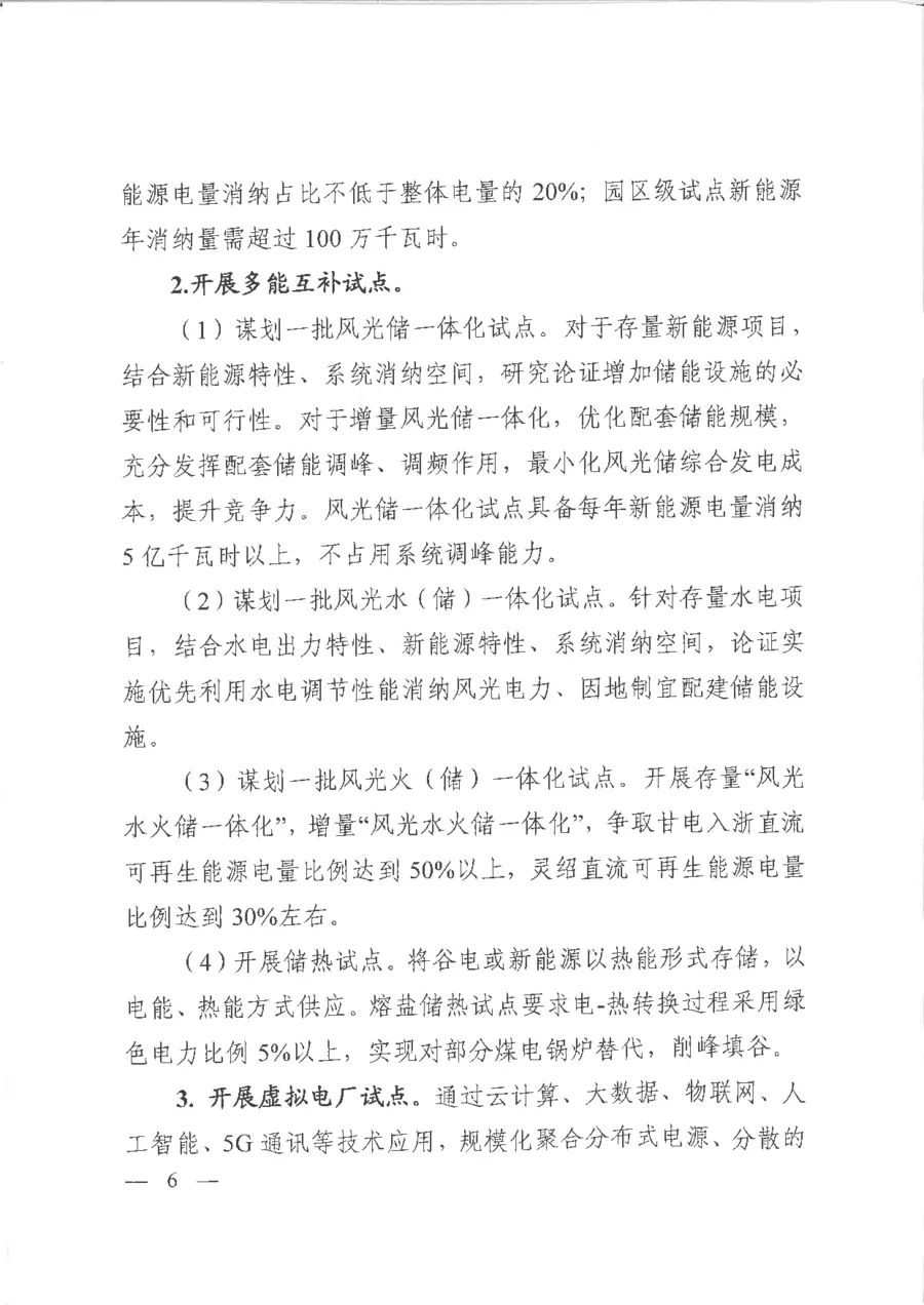 近日,浙江省“十四五”新型電力系統(tǒng)試點(diǎn)建設(shè)方案發(fā)布。方案中提到,積極推進(jìn)源網(wǎng)荷儲(chǔ)一體化、多能互補(bǔ)、虛擬電廠、智慧電廠等關(guān)鍵示范,充分挖掘系統(tǒng)靈活性調(diào)節(jié)能力和需求側(cè)資源,強(qiáng)化源網(wǎng)荷儲(chǔ)各環(huán)節(jié)間協(xié)調(diào)互動(dòng),提升新能源消納水平。 開(kāi)展源網(wǎng)荷儲(chǔ)一體化試點(diǎn): (1)創(chuàng)建一批市(縣)級(jí)源網(wǎng)荷儲(chǔ)一體化試點(diǎn)。融合電源側(cè)、電網(wǎng)側(cè)、負(fù)荷側(cè)、儲(chǔ)能側(cè)等多種資源,在重點(diǎn)城市建設(shè)堅(jiān)強(qiáng)局部電網(wǎng),保障地區(qū)清潔可靠用能,支撐高質(zhì)量建設(shè)共同富裕示范區(qū)。 (2)創(chuàng)建一批園區(qū)級(jí)源網(wǎng)荷儲(chǔ)一體化試點(diǎn)。在工業(yè)負(fù)荷大、新能源條件好的開(kāi)發(fā)區(qū)、園區(qū),支持分布式電源開(kāi)發(fā)建設(shè)和就近接入消納,調(diào)動(dòng)負(fù)荷側(cè)調(diào)節(jié)響應(yīng)能力,開(kāi)展綠色供電園區(qū)建設(shè)。在城市新區(qū)、綜合體、社區(qū)(未來(lái)社區(qū))、小微園區(qū)等,依托光伏發(fā)電、儲(chǔ)能、氫能、充電基礎(chǔ)設(shè)施等,開(kāi)展分布式發(fā)電與電動(dòng)汽車(用戶儲(chǔ)能)靈活互動(dòng)。積極打造增量配電網(wǎng)等微電網(wǎng)系統(tǒng),優(yōu)先支持能源與交通、建筑等其他基礎(chǔ)設(shè)施融合發(fā)展試點(diǎn)。 市(縣)級(jí)試點(diǎn)新能源年消納量需超過(guò)0.5億千瓦時(shí),新能源電量消納占比不低于整體電量的20%;園區(qū)級(jí)試點(diǎn)新能源年消納量需超過(guò)100萬(wàn)千瓦時(shí)。 開(kāi)展多能互補(bǔ)試點(diǎn): (1)謀劃一批風(fēng)光儲(chǔ)一體化試點(diǎn)。對(duì)于存量新能源項(xiàng)目,結(jié)合新能源特性、系統(tǒng)消納空間,研究論證增加儲(chǔ)能設(shè)施的必要性和可行性。對(duì)于增量風(fēng)光儲(chǔ)一體化,優(yōu)化配套儲(chǔ)能規(guī)模,充分發(fā)揮配套儲(chǔ)能調(diào)峰、調(diào)頻作用,最小化風(fēng)光儲(chǔ)綜合發(fā)電成本,提升競(jìng)爭(zhēng)力。風(fēng)光儲(chǔ)一體化試點(diǎn)具備每年新能源電量消納5億千瓦時(shí)以上,不占用系統(tǒng)調(diào)峰能力。 (2)謀劃一批風(fēng)光水(儲(chǔ))一體化試點(diǎn)。針對(duì)存量水電項(xiàng)目,結(jié)合水電出力特性、新能源特性、系統(tǒng)消納空間,論證實(shí)施優(yōu)先利用水電調(diào)節(jié)性能消納風(fēng)光電力、因地制宜配建儲(chǔ)能設(shè)施。 (3)謀劃一批風(fēng)光火(儲(chǔ))一體化試點(diǎn)。開(kāi)展存量“風(fēng)光水火儲(chǔ)一體化”,增量“風(fēng)光水火儲(chǔ)一體化”,爭(zhēng)取甘電入浙直流可再生能源電量比例達(dá)到50%以上,靈紹直流可再生能源電量比例達(dá)到30%左右。 詳情如下: