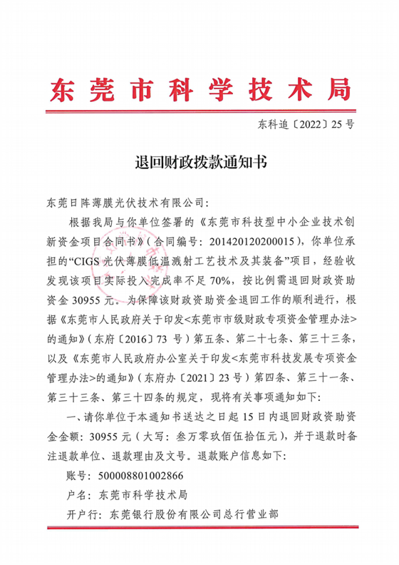 5月20日,東莞市科學(xué)技術(shù)局發(fā)布《退款公告(東莞日陣薄膜光伏技術(shù)有限公司)》,根據(jù)公告,因東莞日陣薄膜光伏技術(shù)有限公司承擔(dān)的“CIGS光伏薄膜低溫濺射工藝技術(shù)及其裝備”項目,經(jīng)驗收發(fā)現(xiàn)該項目實際投入完成率不足70%,按比例需退回財政資助資金30955元。