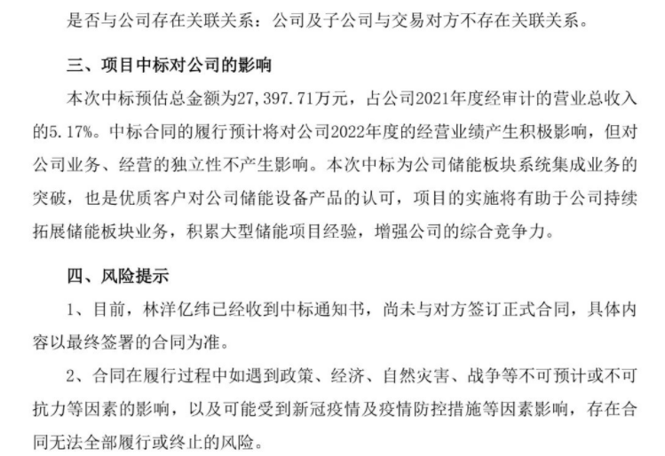 總額超2.7億!林洋能源中標(biāo)內(nèi)蒙古風(fēng)電儲能設(shè)備采購5月23日晚間,林洋能源發(fā)布公告稱公司控股子公司江蘇林洋億緯儲能科技有限公司正式中標(biāo)中國能源建設(shè)集團(tuán)湖南火電建設(shè)有限公司新能源工程公司華能巴彥諾日公300MW風(fēng)電EPC項(xiàng)目儲能設(shè)備采購,預(yù)估中標(biāo)總金額為2.74億元。 林洋能源自2015年以來,在一系列儲能示范項(xiàng)目中積累了多年的技術(shù)經(jīng)驗(yàn)和團(tuán)隊(duì)儲備資源。同時,在儲能業(yè)務(wù)上更是通過合資、合作等方式進(jìn)行了全面加速布局,實(shí)現(xiàn)儲能關(guān)鍵產(chǎn)業(yè)鏈全覆蓋。此次中標(biāo)項(xiàng)目中,林洋儲能將為項(xiàng)目提供儲能電站核心設(shè)備及儲能系統(tǒng)集成,打造“高安全、長壽命、高效率、低衰減、智能化、高收益”的新能源配套儲能示范項(xiàng)目。 截至2021年底,林洋儲備的各類儲能項(xiàng)目已超3GWh。林洋能源與湖北億緯動力有限公司共同出資設(shè)立合資公司江蘇億緯林洋儲能技術(shù)有限公司,建設(shè)年產(chǎn)能10GWh的儲能專用磷酸鐵鋰電池生產(chǎn)基地項(xiàng)目,目前該項(xiàng)目已動工建設(shè),預(yù)計年內(nèi)投產(chǎn)。 2022年林洋能源及林洋儲能公司將緊抓儲能市場爆發(fā)性增長機(jī)遇,打造創(chuàng)新的儲能系統(tǒng)集成優(yōu)勢和“集中式共享儲能”運(yùn)營商業(yè)模式,建設(shè)年產(chǎn)能達(dá)2GW的規(guī)?;瘍δ躊ACK工廠一期項(xiàng)目,未來3年累計建設(shè)不低于5GWh儲能項(xiàng)目。 此次林洋能源中標(biāo)中國能源建設(shè)集團(tuán)湖南火電建設(shè)有限公司儲能項(xiàng)目,為華能集團(tuán)位于內(nèi)蒙古的300MW風(fēng)電配套儲能提供系統(tǒng)集成設(shè)備和方案,將進(jìn)一步推動林洋能源與央企能源集團(tuán)及戰(zhàn)略合作伙伴在儲能業(yè)務(wù)方面的深度合作,為行業(yè)提供創(chuàng)新可靠的新能源配套儲能電站系統(tǒng)集成解決方案。 原文公告如下: