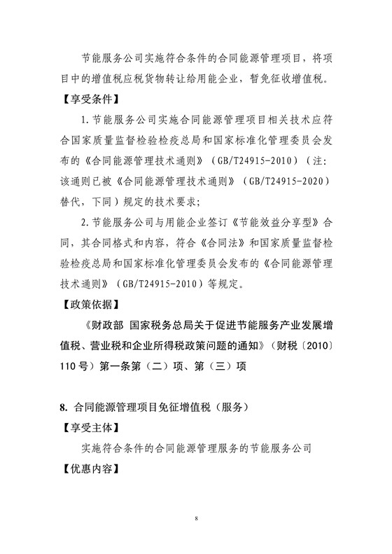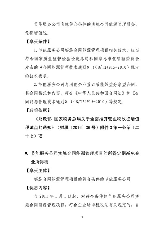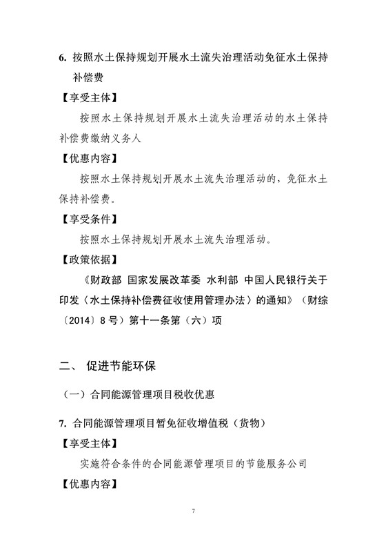 5月31日,國家稅務總局發(fā)布《支持綠色發(fā)展稅費優(yōu)惠政策指引》,匯總了實施的56項支持綠色發(fā)展的稅費優(yōu)惠政策,在“風力、水力、光伏發(fā)電和核電產(chǎn)業(yè)稅費優(yōu)惠”上,包含如下7項: 1.風力發(fā)電增值稅即征即退 2.水電站部分用地免征城鎮(zhèn)土地使用稅 3.分布式光伏發(fā)電自發(fā)自用電量免收國家重大水利工程建設基金 4.分布式光伏發(fā)電自發(fā)自用電量免收可再生能源電價附加 5.分布式光伏發(fā)電自發(fā)自用電量免收大中型水庫移民后期扶持基金 6.分布式光伏發(fā)電自發(fā)自用電量免收農(nóng)網(wǎng)還貸資金 7.核電站部分用地免征城鎮(zhèn)土地使用稅 詳情如下: 支持綠色發(fā)展稅費優(yōu)惠政策指引 “綠水青山就是金山銀山”,節(jié)約資源、保護環(huán)境是我國基本國策,關乎人民福祉,關乎國家民族未來。為助力經(jīng)濟社會發(fā)展全面綠色轉(zhuǎn)型,實施可持續(xù)發(fā)展戰(zhàn)略,國家從支持環(huán)境保護、促進節(jié)能環(huán)保、鼓勵資源綜合利用、推動低碳產(chǎn)業(yè)發(fā)展四個方面,實施了56項支持綠色發(fā)展的稅費優(yōu)惠政策。 一、支持環(huán)境保護 為減少主要污染物排放,有效控制環(huán)境風險,國家積極支持生態(tài)環(huán)境保護項目建設,促進企業(yè)加快環(huán)境保護設備升級改造,推進環(huán)境污染第三方治理,優(yōu)化自然生態(tài)環(huán)境發(fā)展。具體包括: (一)環(huán)境保護稅收優(yōu)惠 1.從事符合條件的環(huán)境保護的所得定期減免企業(yè)所得稅 2.購置用于環(huán)境保護專用設備的投資額按一定比例實行企業(yè)所得稅稅額抵免 3.從事污染防治的第三方企業(yè)減按15%的稅率征收企業(yè)所得稅 4.企業(yè)廠區(qū)以外的公共綠化用地免征城鎮(zhèn)土地使用稅 (二)水土保持稅費優(yōu)惠 5.建設市政生態(tài)環(huán)境保護基礎設施項目免征水土保持補償費 6.按照水土保持規(guī)劃開展水土流失治理活動免征水土保持補償費 二、促進節(jié)能環(huán)保 為加強環(huán)境管理與治理,大幅降低污染物排放強度,減少工業(yè)化、城鎮(zhèn)化對生態(tài)環(huán)境的影響,改善人居環(huán)境,努力提高環(huán)境質(zhì)量,現(xiàn)行稅收政策在推廣合同能源管理項目、保障居民供熱采暖、推進電池制造、建材等行業(yè)綠色化改造、促進節(jié)能節(jié)水環(huán)保、支持新能源車船使用、鼓勵污染物集中安全處置等方面實施了一系列優(yōu)惠政策,不斷改善空氣、水環(huán)境質(zhì)量,有效管控土壤污染。具體包括: (一)合同能源管理項目稅收優(yōu)惠 7.合同能源管理項目暫免征收增值稅(貨物) 8.合同能源管理項目暫免征收增值稅(服務) 9.節(jié)能服務公司實施合同能源管理項目的所得定期減免企業(yè)所得稅 (二)供熱企業(yè)稅收優(yōu)惠 10.供熱企業(yè)向居民個人取得的采暖費收入免征增值稅 11.為居民供熱的供熱企業(yè)使用的廠房免征房產(chǎn)稅 12.為居民供熱的供熱企業(yè)使用的土地免征城鎮(zhèn)土地使用稅 (三)節(jié)能環(huán)保電池、涂料稅收優(yōu)惠 13.節(jié)能環(huán)保電池免征消費稅 14.節(jié)能環(huán)保涂料免征消費稅 (四)節(jié)能節(jié)水稅收優(yōu)惠 15.滴灌產(chǎn)品免征增值稅 16.從事符合條件的節(jié)能節(jié)水項目的所得定期減免企業(yè)所得稅 17.購置用于節(jié)能節(jié)水專用設備的投資額按一定比例實行企業(yè)所得稅稅額抵免 (五)新能源車船稅收優(yōu)惠 18.新能源車船免征車船稅 19.節(jié)能汽車減半征收車船稅 20.新能源汽車免征車輛購置稅 (六)節(jié)約水資源稅收優(yōu)惠 21.取用污水處理再生水免征水資源稅 22.抽水蓄能發(fā)電取用水免征水資源稅 23.采油排水經(jīng)分離凈化后在封閉管道回注的免征水資源稅 (七)污染物減排稅收優(yōu)惠 24.農(nóng)業(yè)生產(chǎn)排放污染物免征環(huán)境保護稅 25.城鄉(xiāng)污水集中處理、生活垃圾集中處理場所排放污染物免征環(huán)境保護稅 26.排放應稅大氣污染物或者水污染物的濃度值低于國家和地方規(guī)定的污染物排放標準減征環(huán)境保護稅 三、鼓勵資源綜合利用 開展資源綜合利用,提高資源利用效率,是推進綠色低碳循環(huán)發(fā)展、保障資源供給安全的重要內(nèi)容,對于緩解資源環(huán)境對經(jīng)濟社會發(fā)展約束具有重要現(xiàn)實意義。國家不斷加大資源綜合利用稅收優(yōu)惠政策支持力度,加強對廢棄物綜合利用、污水垃圾處理、礦產(chǎn)資源高效利用、水利工程建設等方面政策扶持,著力提升資源利用效率,促進經(jīng)濟社會發(fā)展全面綠色轉(zhuǎn)型。具體包括: (一)資源綜合利用稅收優(yōu)惠 27.新型墻體材料增值稅即征即退 28.資源綜合利用產(chǎn)品及勞務增值稅即征即退 29.綜合利用資源生產(chǎn)產(chǎn)品取得的收入在計算應納稅所得額時減計收入 30.利用廢棄動植物油生產(chǎn)純生物柴油免征消費稅 31.利用廢礦物油生產(chǎn)的工業(yè)油料免征消費稅 32.承受荒山、荒地、荒灘用于農(nóng)、林、牧、漁業(yè)生產(chǎn)免征契稅 33.綜合利用的固體廢物免征環(huán)境保護稅 (二)污水處理稅收優(yōu)惠 34.污水處理廠生產(chǎn)的再生水增值稅即征即退或免征增值稅 35.垃圾處理、