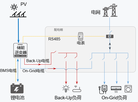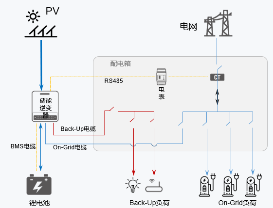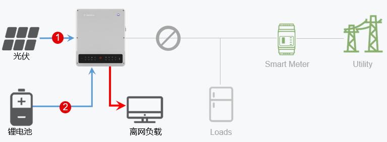 說(shuō)明:電網(wǎng)斷電時(shí)離網(wǎng)負(fù)載可以由光伏和電池供電不間斷工作;離網(wǎng)端由電網(wǎng)切換到電池供電為UPS供電。