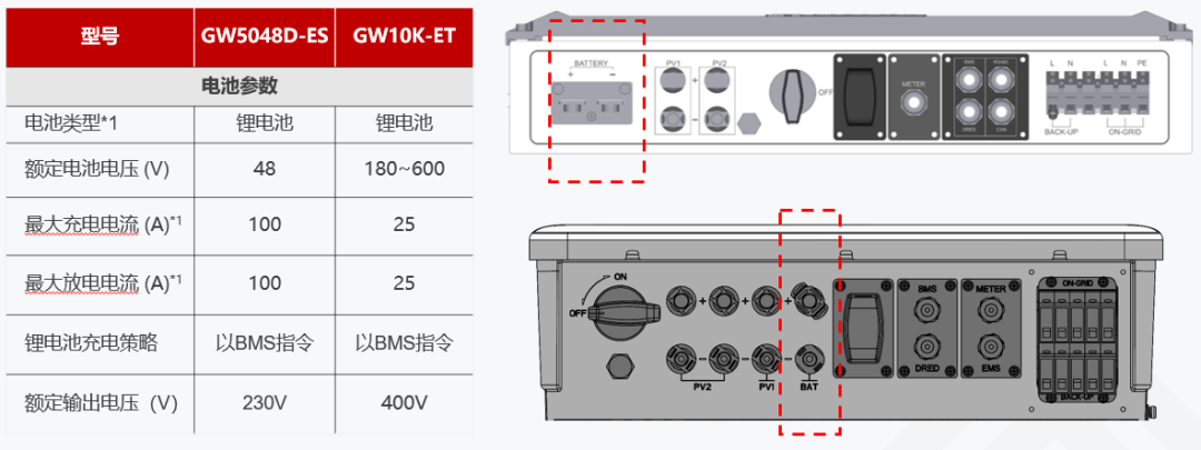 但是ES和ET之間也是有區(qū)別的,ES是單相雙向儲(chǔ)能逆變器、ET則針對(duì)三相電網(wǎng)的;并且它支持不平衡三相輸出,支持單相負(fù)載;另外ES是接的低壓電池,ET電壓范圍更高,是接的高壓電池 ;那它們充放電電流也是不同。這個(gè)在逆變器的接口上也會(huì)反應(yīng)出來(lái)。