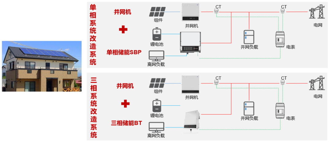 儲(chǔ)能系統(tǒng)分為單相、三相;下面圖片為簡(jiǎn)單的儲(chǔ)能系統(tǒng)圖,除了三大件其中還包括電表、家庭負(fù)載等,可以看到不管是單相還是三相我們都有對(duì)應(yīng)的解決方案。 插入鏈接 ![]()