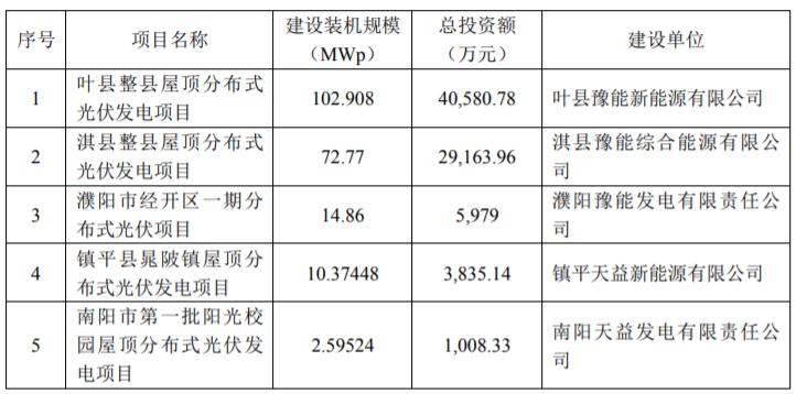 6月7日晚,豫能控股發(fā)布公告稱,公司子公司葉縣豫能新能源有限公司、淇縣豫能綜合能源有限公司、濮陽豫能發(fā)電有限責(zé)任公司、鎮(zhèn)平天益新能源有限公司、南陽天益發(fā)電有限公司擬對外投資建設(shè)葉縣整縣屋頂分布式光伏發(fā)電項(xiàng)目、淇縣整縣屋頂分布式光伏發(fā)電項(xiàng)目、濮陽市經(jīng)開區(qū)一期分布式光伏項(xiàng)目、鎮(zhèn)平縣晁陂鎮(zhèn)屋頂分布式光伏發(fā)電項(xiàng)目、南陽市第一批陽光校園屋頂分布式光伏發(fā)電項(xiàng)目5個(gè)屋頂分布式光伏項(xiàng)目,總建設(shè)裝機(jī)規(guī)模203.50772MWp,總投資額80,567.21萬元。 其中,葉縣整縣屋頂分布式光伏發(fā)電項(xiàng)目、鎮(zhèn)平縣晁陂鎮(zhèn)屋頂分布式光伏發(fā)電項(xiàng)目建設(shè)工期為12個(gè)月,淇縣整縣屋頂分布式光伏發(fā)電項(xiàng)目建設(shè)工期24個(gè)月,濮陽市經(jīng)開區(qū)一期分布式光伏發(fā)電項(xiàng)目建設(shè)工期10個(gè)月,南陽市第一批陽光校園屋頂分布式光伏發(fā)電項(xiàng)目建設(shè)工期3個(gè)月。 豫能控股表示,本次投資建設(shè)分布式光伏項(xiàng)目是實(shí)現(xiàn)碳達(dá)峰、碳中和目標(biāo),落實(shí)鄉(xiāng)村振興發(fā)展戰(zhàn)略,保障能源安全,加快公司向綜合能源服務(wù)商轉(zhuǎn)型發(fā)展的重要舉措,對促進(jìn)國家能源轉(zhuǎn)型、 保障河南省電力供應(yīng)、公司可持續(xù)發(fā)展具有積極作用。