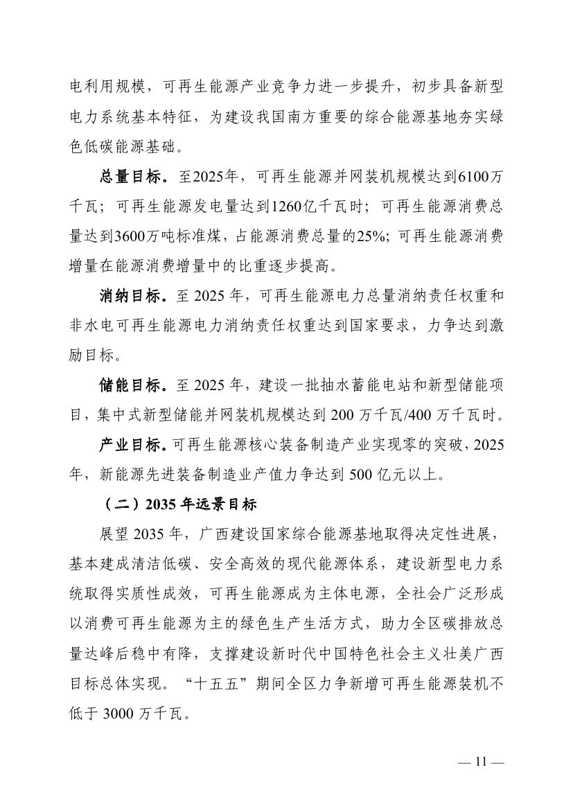 6月6日,廣西發(fā)改委印發(fā)《廣西可再生能源發(fā)展“十四五”規(guī)劃》,桂發(fā)改新能〔2022〕602號(hào)。 《規(guī)劃》指出,至2025年,可再生能源并網(wǎng)裝機(jī)規(guī)模達(dá)到6100萬千瓦;可再生能源發(fā)電量達(dá)到1260億千瓦時(shí);可再生能源消費(fèi)總量達(dá)到3600萬噸標(biāo)準(zhǔn)煤,占能源消費(fèi)總量的25%;可再生能源消費(fèi)增量在能源消費(fèi)增量中的比重逐步提高。 “十五五”期間全區(qū)力爭(zhēng)新增可再生能源裝機(jī)不低于3000萬千瓦。 “十四五”期間,新增水電并網(wǎng)裝機(jī)規(guī)模110萬千瓦以上,力爭(zhēng)達(dá)到200萬千瓦。 “十四五”期間,新增生活垃圾發(fā)電并網(wǎng)裝機(jī)規(guī)模60萬千瓦左右。“十四五”期間,新增農(nóng)林生物質(zhì)發(fā)電并網(wǎng)裝機(jī)規(guī)模不低于40萬千瓦。 全文如下: