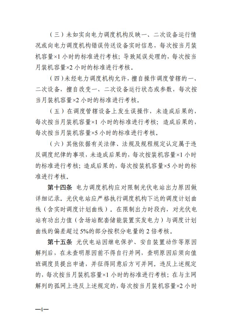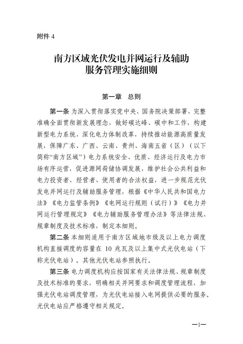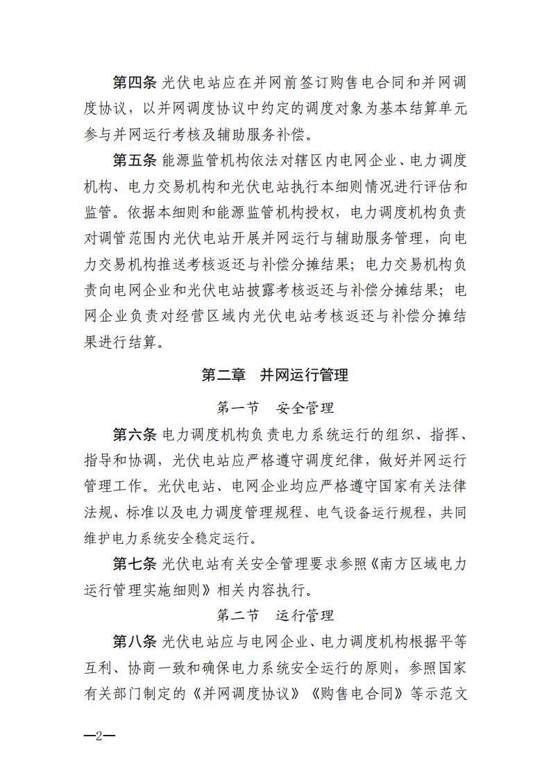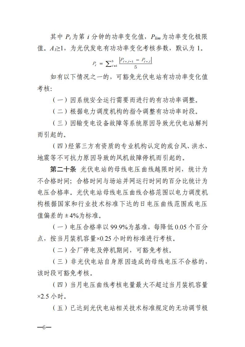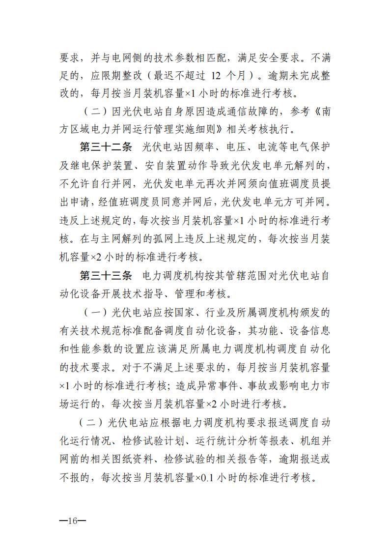 6月13日,國家能源局南方監(jiān)管局印發(fā)《南方區(qū)域光伏發(fā)電并網(wǎng)運(yùn)行及輔助服務(wù)管理實(shí)施細(xì)則》(以下簡稱《實(shí)施細(xì)則》)的通知?!秾?shí)施細(xì)則》指出,光伏電站應(yīng)與電網(wǎng)企業(yè)、電力調(diào)度機(jī)構(gòu)根據(jù)平等互利、協(xié)商一致和確保電力系統(tǒng)安全運(yùn)行的原則,參照國家有關(guān)部門制定的《并網(wǎng)調(diào)度協(xié)議》《購售電合同》等示范文本及時(shí)簽訂并網(wǎng)調(diào)度協(xié)議和購售電合同,無協(xié)議(合同)光伏電站不得并網(wǎng)運(yùn)行。 光伏電站在并網(wǎng)調(diào)度協(xié)議簽訂后1個(gè)月內(nèi),應(yīng)書面向電力調(diào)度機(jī)構(gòu)申報(bào)投產(chǎn)年月,較申報(bào)投產(chǎn)時(shí)間每延遲一月按并網(wǎng)調(diào)度協(xié)議約定的裝機(jī)容量×1小時(shí)的標(biāo)準(zhǔn)進(jìn)行考核。 新建光伏電站自并網(wǎng)容量大于10兆瓦,次月起按本細(xì)則開展考核與補(bǔ)償,未全容量并網(wǎng)前按當(dāng)月實(shí)際裝機(jī)容量開展相關(guān)考核。光伏電站因擴(kuò)建原因被考核,由光伏電站向電力調(diào)度機(jī)構(gòu)申訴并經(jīng)能源監(jiān)管機(jī)構(gòu)同意的,可豁免考核。 光伏電站應(yīng)按要求從規(guī)劃、設(shè)計(jì)、建設(shè)、試驗(yàn)以及運(yùn)行方面做好相關(guān)工作,提升光伏電站并網(wǎng)友好性水平,確保光伏電站安全、高效并網(wǎng)及系統(tǒng)運(yùn)行安全穩(wěn)定。 光伏電站應(yīng)按電力調(diào)度機(jī)構(gòu)的要求及時(shí)報(bào)送運(yùn)行信息,未按要求報(bào)送信息,或虛報(bào)、瞞報(bào)信息,每次按當(dāng)月裝機(jī)容量×1小時(shí)的標(biāo)準(zhǔn)進(jìn)行考核。 原文如下: