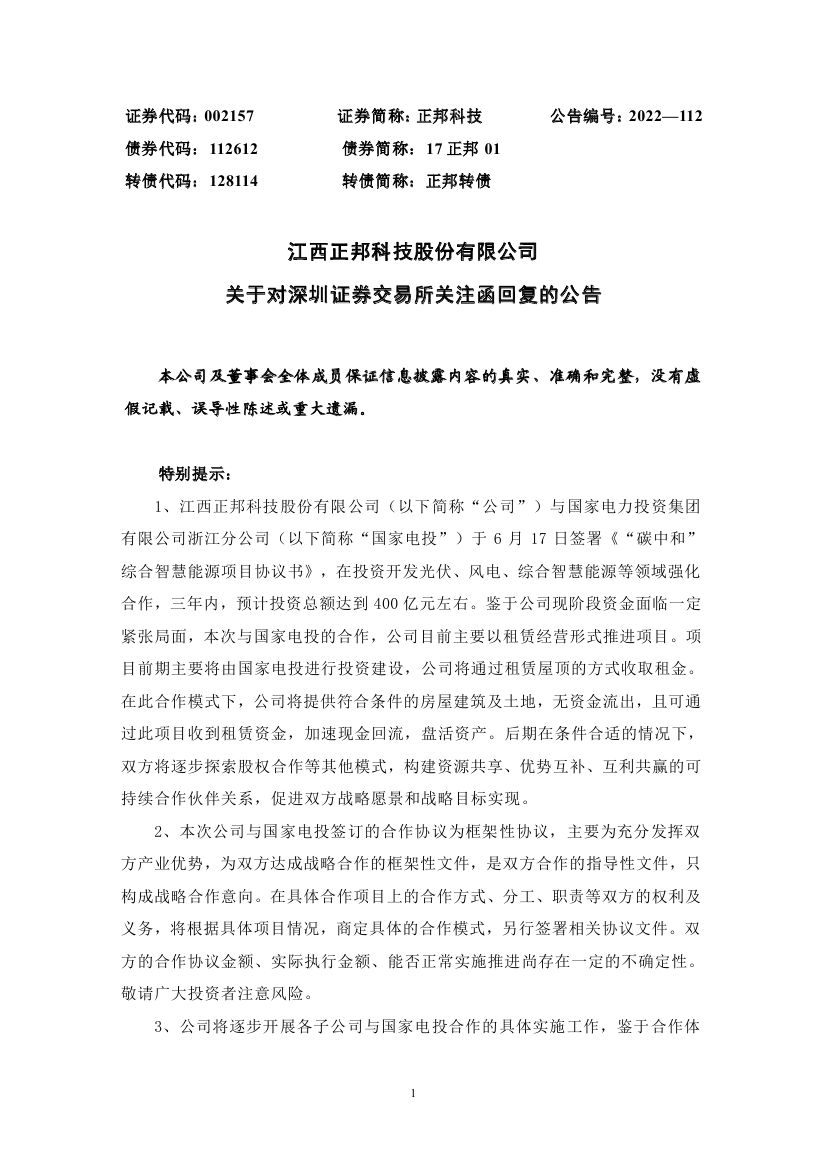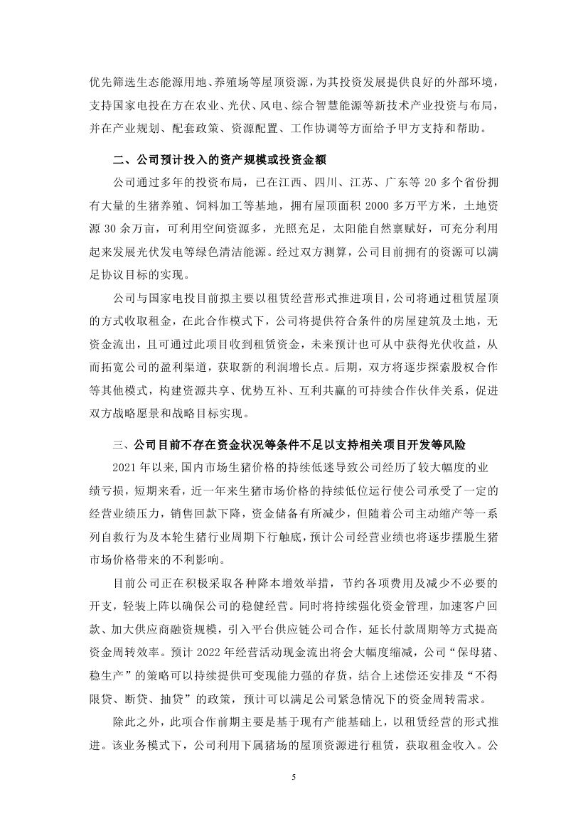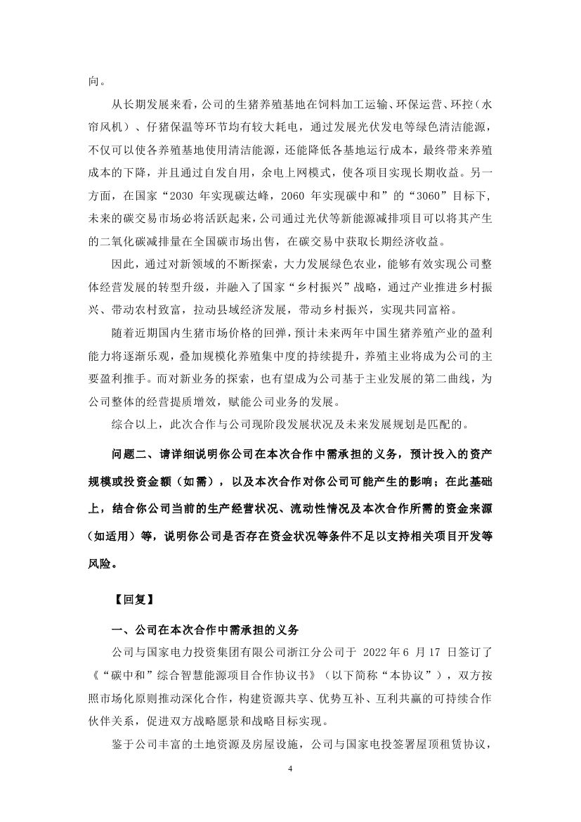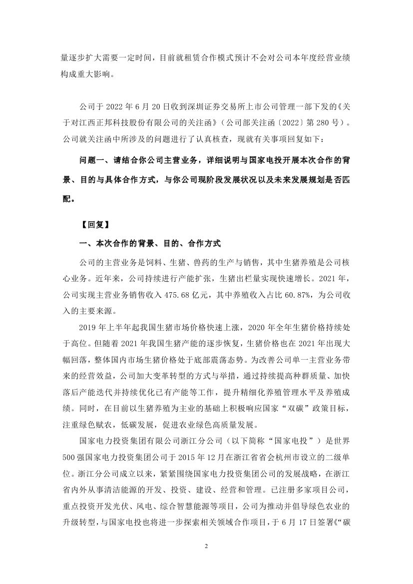 6月23日,江西正邦科技股份有限公司發(fā)布關于對深圳證券交易所關注函回復的公告。此前于6月17日,正邦科技與國家電投簽訂《“碳中和”綜合智慧能源項目合作協(xié)議書》引發(fā)諸多關注,在投資開發(fā)光伏、風電、綜合智慧能源等領域強化 合作,三年內,預計投資總額達到 400 億元左右。 正邦科技表示,本次與國家電投的合作,公司目前主要以租賃經營形式推進項目。項目前期主要將由國家電投進行投資建設,公司將通過租賃屋頂的方式收取租金。在此合作模式下,公司將提供符合條件的房屋建筑及土地,無資金流出,且可通過此項目收到租賃資金,加速現金回流,盤活資產。后期在條件合適的情況下,雙方將逐步探索股權合作等其他模式,構建資源共享、優(yōu)勢互補、互利共贏的可持續(xù)合作伙伴關系,促進雙方戰(zhàn)略愿景和戰(zhàn)略目標實現。 針對市場的質疑,在回復函公告中,正邦科技結合主營業(yè)務詳細解釋了此次合作與其公司未來發(fā)展的規(guī)劃。 在“碳中和”已成為全球共識的背景下,綠色低碳已成為各行各業(yè)轉型發(fā)展的必經之路。正邦科技表示,從長期發(fā)展來看,正邦科技的生豬養(yǎng)殖基地在飼料加工運輸、環(huán)保運營、環(huán)控(水簾風機)、仔豬保溫等環(huán)節(jié)均有較大耗電,通過發(fā)展光伏發(fā)電等綠色清潔能源,不僅可以使各養(yǎng)殖基地使用清潔能源,還能降低各基地運行成本,最終帶來養(yǎng)殖成本的下降,并且通過自發(fā)自用,余電上網模式,使各項目實現長期收益。 另一方面,在國家“2030年實現碳達峰,2060年實現碳中和”的“3060”目標下,未來的碳交易市場必將活躍起來,公司通過光伏等新能源減排項目可以將其產生的二氧化碳減排量在全國碳市場出售,在碳交易中獲取長期經濟收益。 因此,通過對新領域的不斷探索,大力發(fā)展綠色農業(yè),能夠有效實現公司整體經營發(fā)展的轉型升級,并融入了國家“鄉(xiāng)村振興”戰(zhàn)略,通過產業(yè)推進鄉(xiāng)村振興、帶動農村致富,拉動縣域經濟發(fā)展,帶動鄉(xiāng)村振興,實現共同富裕。