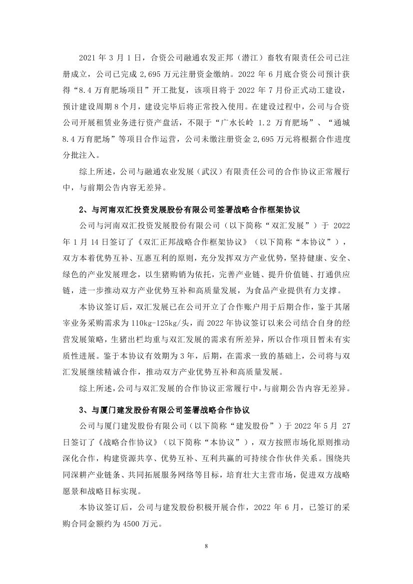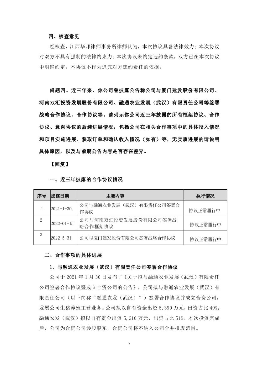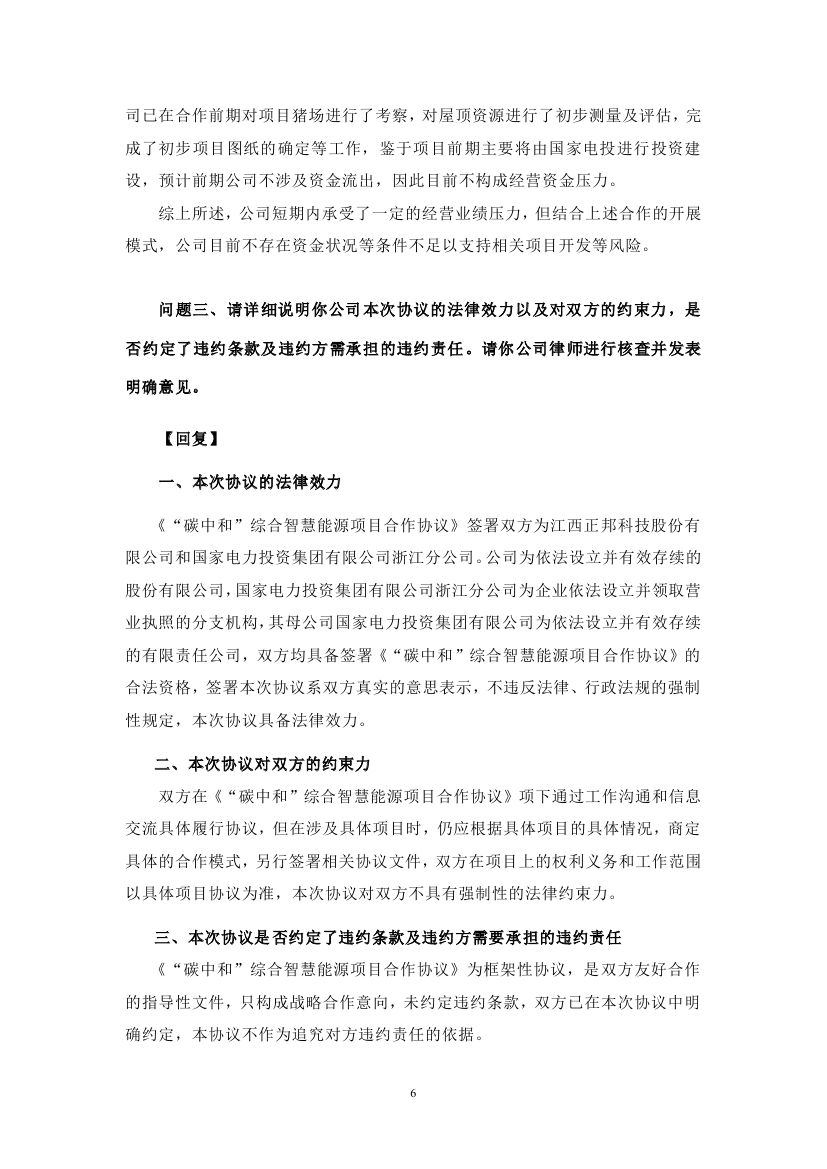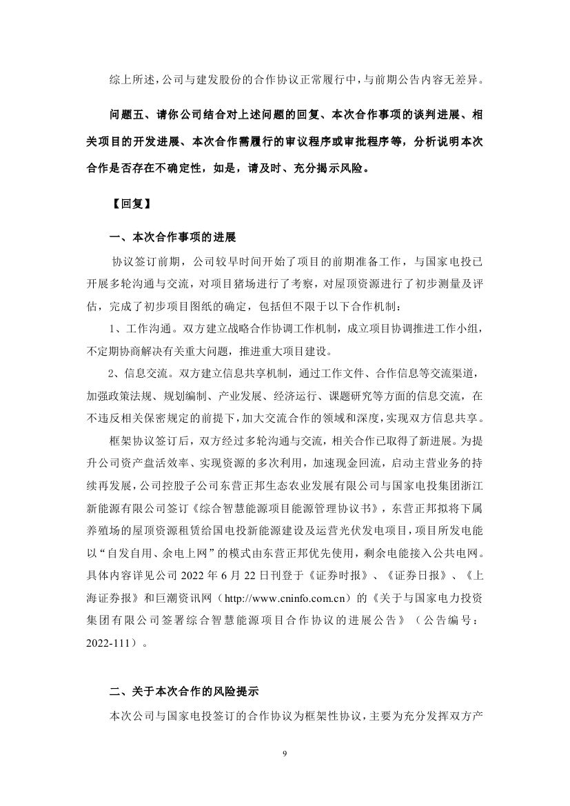 6月23日,江西正邦科技股份有限公司發(fā)布關于對深圳證券交易所關注函回復的公告。此前于6月17日,正邦科技與國家電投簽訂《“碳中和”綜合智慧能源項目合作協(xié)議書》引發(fā)諸多關注,在投資開發(fā)光伏、風電、綜合智慧能源等領域強化 合作,三年內,預計投資總額達到 400 億元左右。 正邦科技表示,本次與國家電投的合作,公司目前主要以租賃經營形式推進項目。項目前期主要將由國家電投進行投資建設,公司將通過租賃屋頂的方式收取租金。在此合作模式下,公司將提供符合條件的房屋建筑及土地,無資金流出,且可通過此項目收到租賃資金,加速現金回流,盤活資產。后期在條件合適的情況下,雙方將逐步探索股權合作等其他模式,構建資源共享、優(yōu)勢互補、互利共贏的可持續(xù)合作伙伴關系,促進雙方戰(zhàn)略愿景和戰(zhàn)略目標實現。 針對市場的質疑,在回復函公告中,正邦科技結合主營業(yè)務詳細解釋了此次合作與其公司未來發(fā)展的規(guī)劃。 在“碳中和”已成為全球共識的背景下,綠色低碳已成為各行各業(yè)轉型發(fā)展的必經之路。正邦科技表示,從長期發(fā)展來看,正邦科技的生豬養(yǎng)殖基地在飼料加工運輸、環(huán)保運營、環(huán)控(水簾風機)、仔豬保溫等環(huán)節(jié)均有較大耗電,通過發(fā)展光伏發(fā)電等綠色清潔能源,不僅可以使各養(yǎng)殖基地使用清潔能源,還能降低各基地運行成本,最終帶來養(yǎng)殖成本的下降,并且通過自發(fā)自用,余電上網模式,使各項目實現長期收益。 另一方面,在國家“2030年實現碳達峰,2060年實現碳中和”的“3060”目標下,未來的碳交易市場必將活躍起來,公司通過光伏等新能源減排項目可以將其產生的二氧化碳減排量在全國碳市場出售,在碳交易中獲取長期經濟收益。 因此,通過對新領域的不斷探索,大力發(fā)展綠色農業(yè),能夠有效實現公司整體經營發(fā)展的轉型升級,并融入了國家“鄉(xiāng)村振興”戰(zhàn)略,通過產業(yè)推進鄉(xiāng)村振興、帶動農村致富,拉動縣域經濟發(fā)展,帶動鄉(xiāng)村振興,實現共同富裕。