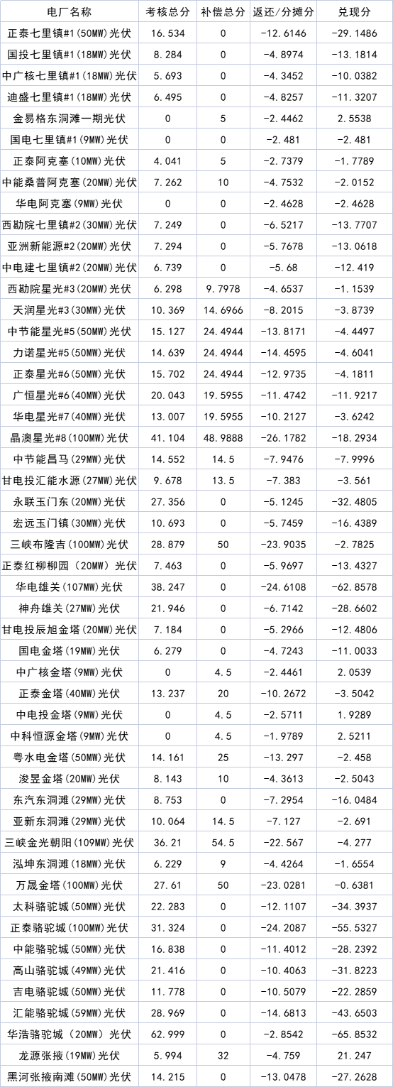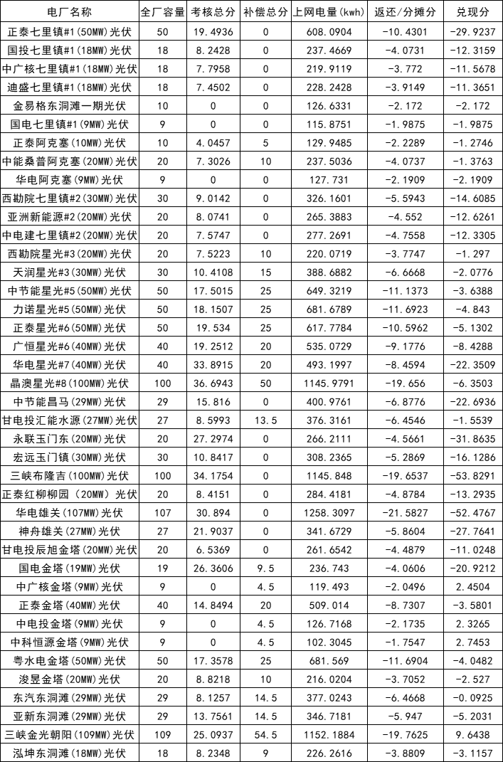 6月28日,甘肅能源監(jiān)管辦發(fā)布關(guān)于公布辦關(guān)于甘肅電網(wǎng)2022年一季度《兩個細則》考核補償結(jié)果預公告。其中,1月份涉及的光伏項目234個、2月份涉及光伏項目257個、3月份涉及光伏項目257個,共計748個。 原文如下: 甘肅能源監(jiān)管辦關(guān)于甘肅電網(wǎng)2022年一季度《兩個細則》考核補償結(jié)果預公告 省內(nèi)各有關(guān)發(fā)電企業(yè): 2022年一季度甘肅電網(wǎng)“兩個細則”考核工作已經(jīng)完成,現(xiàn)對各電廠考核、補償分數(shù)及分攤結(jié)果進行預公告,請各發(fā)電廠認真核對考核、補償結(jié)果,如有疑問,請于2022年7月5日前與甘肅能源監(jiān)管辦或甘肅省電力公司溝通聯(lián)系。 聯(lián)系人及電話:孫守平 0931-2954863 關(guān)鐵英 0931-2966523 2022年1月份光伏電站分攤結(jié)算結(jié)果如下: