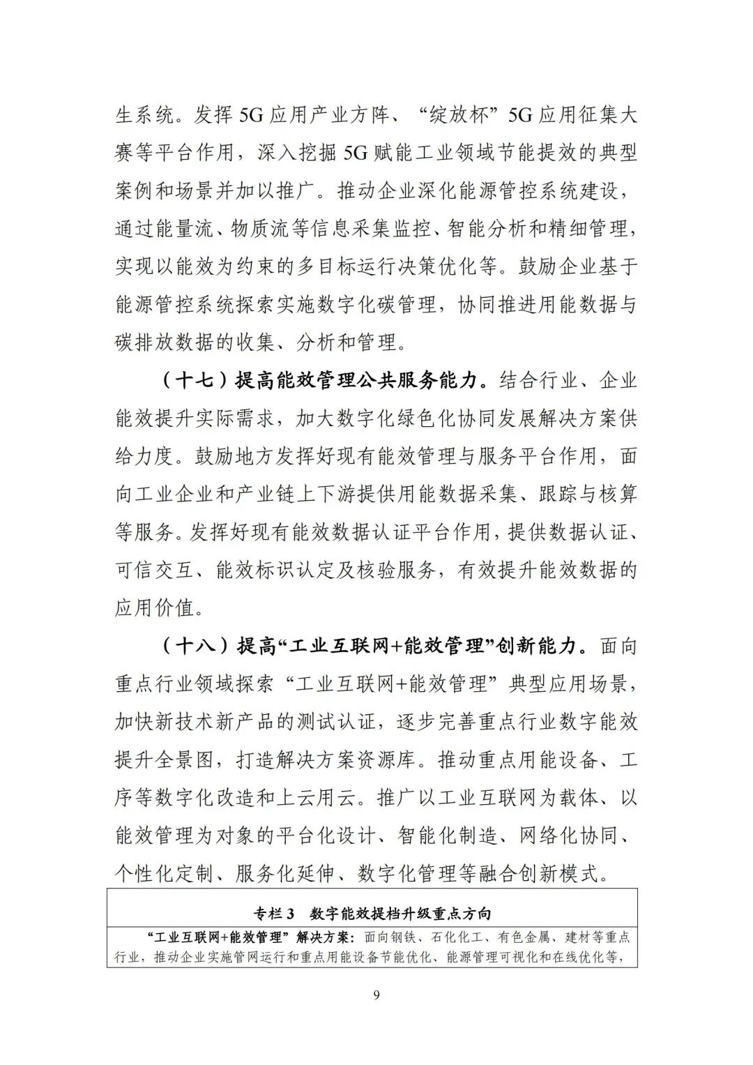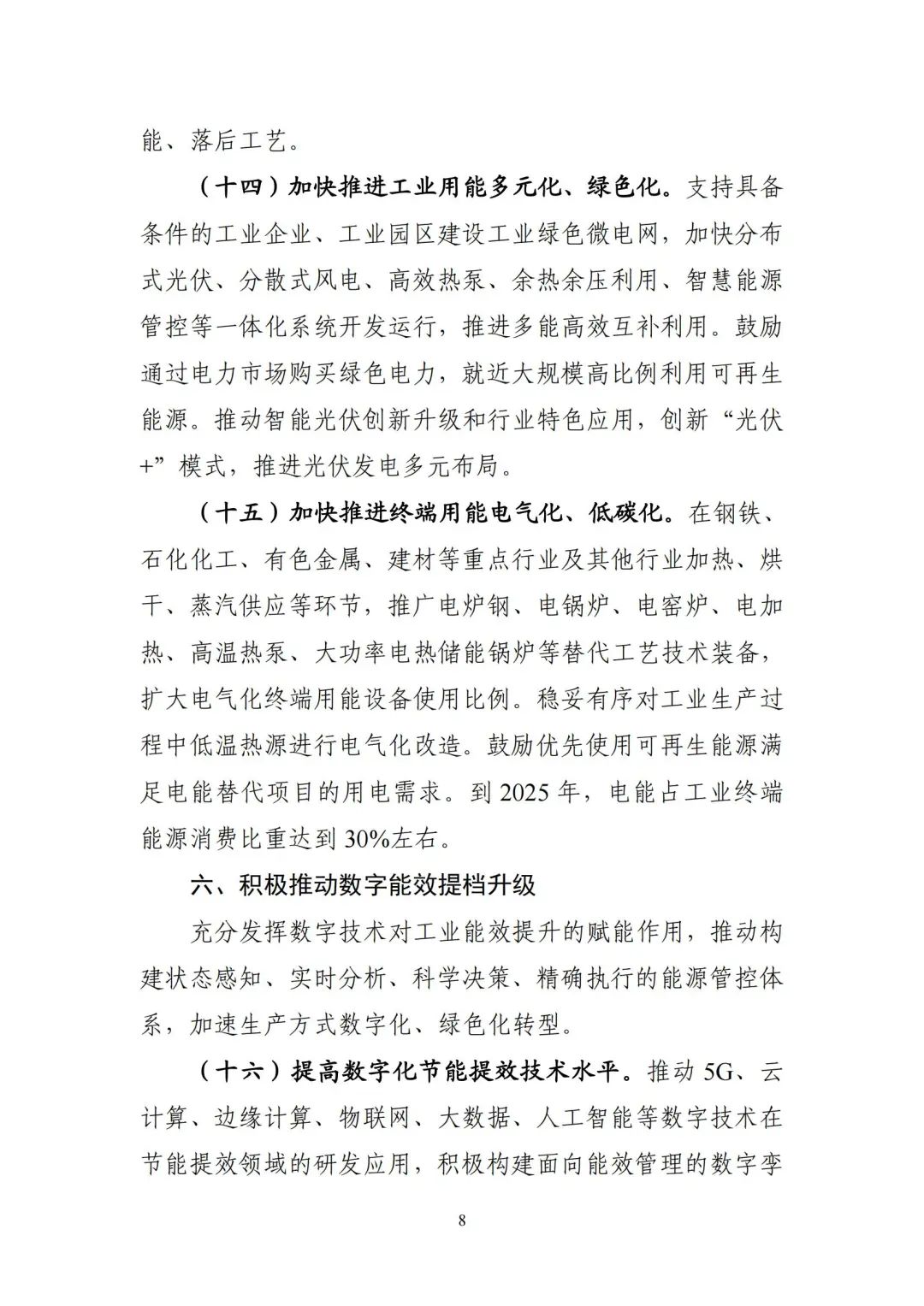 6月23日,工信部等六部門發(fā)布關(guān)于印發(fā)《工業(yè)能效提升行動計劃》,計劃提出,到 2025 年,新建大型、超大型數(shù)據(jù)中心電能利用效率(PUE,指數(shù)據(jù)中心總耗電量與信息設(shè)備耗電量的比值)優(yōu)于1.3;新增高效節(jié)能電機(jī)占比達(dá)到 70%以上;新增高效節(jié)能變壓器占比達(dá)到80%以上;在重點用能行業(yè)遴選 100家能效“領(lǐng)跑者”企業(yè),探索創(chuàng)建10家超級能效工廠;電能占工業(yè)終端能源消費比重達(dá)到30%左右。 加快推進(jìn)工業(yè)用能多元化、綠色化。支持具備條件的工業(yè)企業(yè)、工業(yè)園區(qū)建設(shè)工業(yè)綠色微電網(wǎng),加快分布式光伏、分散式風(fēng)電、高效熱泵、余熱余壓利用、智慧能源管控等一體化系統(tǒng)開發(fā)運行,推進(jìn)多能高效互補(bǔ)利用。鼓勵通過電力市場購買綠色電力,就近大規(guī)模高比例利用可再生能源。推動智能光伏創(chuàng)新升級和行業(yè)特色應(yīng)用,創(chuàng)新“光伏 +”模式,推進(jìn)光伏發(fā)電多元布局。 原文如下: 工業(yè)和信息化部等六部門關(guān)于印發(fā)工業(yè)能效提升行動計劃的通知 工信部聯(lián)節(jié)〔2022〕76號 各省、自治區(qū)、直轄市及計劃單列市、新疆生產(chǎn)建設(shè)兵團(tuán)工業(yè)和信息化主管部門、發(fā)展改革委、財政廳(局)、生態(tài)環(huán)境廳(局)、國資委、市場監(jiān)管局(廳、委),各省、自治區(qū)、直轄市通信管理局,有關(guān)行業(yè)協(xié)會,有關(guān)中央企業(yè): 現(xiàn)將《工業(yè)能效提升行動計劃》印發(fā)給你們,請結(jié)合實際,認(rèn)真貫徹落實。 工業(yè)和信息化部 國家發(fā)展改革委 財政部 生態(tài)環(huán)境部 國務(wù)院國資委 市場監(jiān)管總局 2022年6月23日