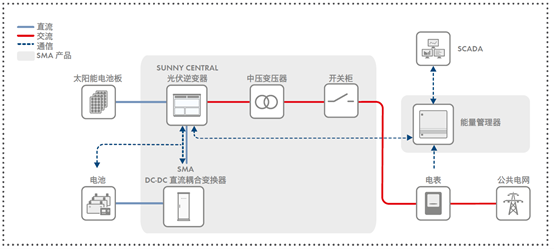 RWE Renewables公司在電站動(dòng)工建設(shè)時(shí)表示,“這是RWE在喬治亞州部署的第一個(gè)太陽(yáng)能發(fā)電項(xiàng)目,也是迄今為止在美國(guó)部署的規(guī)模最大的太陽(yáng)能+儲(chǔ)能項(xiàng)目。 盡管這是混合部署能源的早期案例,但未來(lái)在美國(guó)將會(huì)部署裝機(jī)容量數(shù)十吉瓦的混合能源項(xiàng)目,預(yù)計(jì)直流耦合的太陽(yáng)能+儲(chǔ)能項(xiàng)目的部署將會(huì)越來(lái)越普遍?!?/p> W?rtsil? Energy瓦錫蘭能源是此次光儲(chǔ)項(xiàng)目的系統(tǒng)集成商,W?rtsil?儲(chǔ)能和優(yōu)化副總裁Andy Tang表示,“對(duì)我們來(lái)說(shuō),這是一個(gè)可再生能源整合的里程碑式項(xiàng)目,這是全球范圍內(nèi)使用直流耦合技術(shù)部署的極少數(shù)的大規(guī)模太陽(yáng)能+儲(chǔ)能項(xiàng)目之一?!?/p> SMA直流耦合光儲(chǔ)方案 DC Coupling直流耦合方案,將儲(chǔ)能電池和太陽(yáng)能電池板連接在集中式逆變器直流側(cè),集中式逆變器再與中壓變壓器相連,構(gòu)成完整的直流耦合光儲(chǔ)系統(tǒng)。