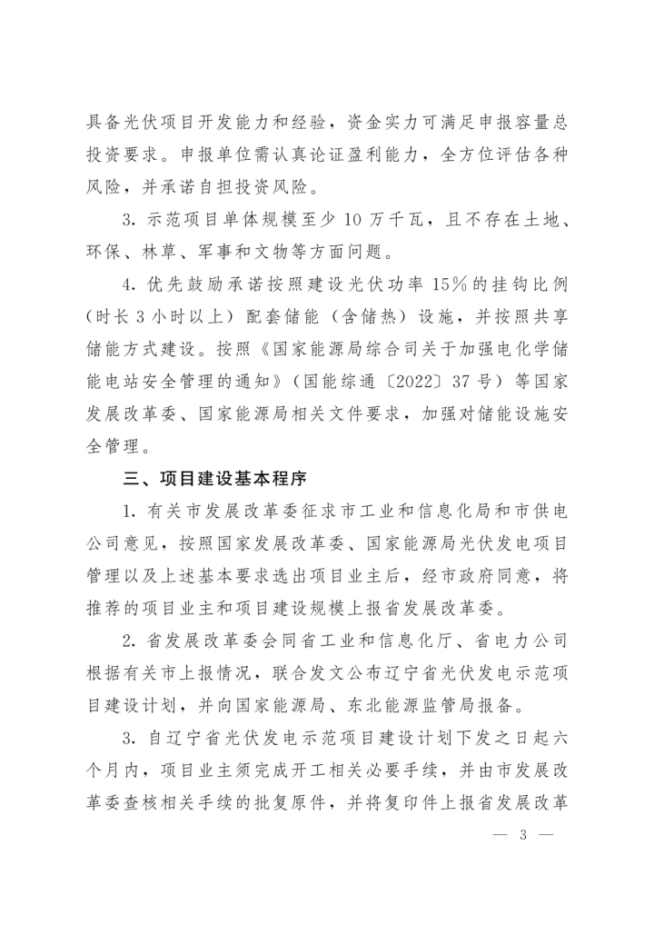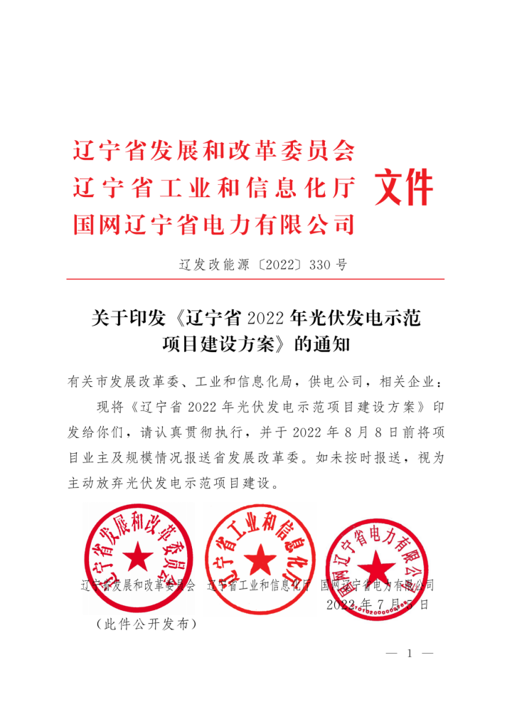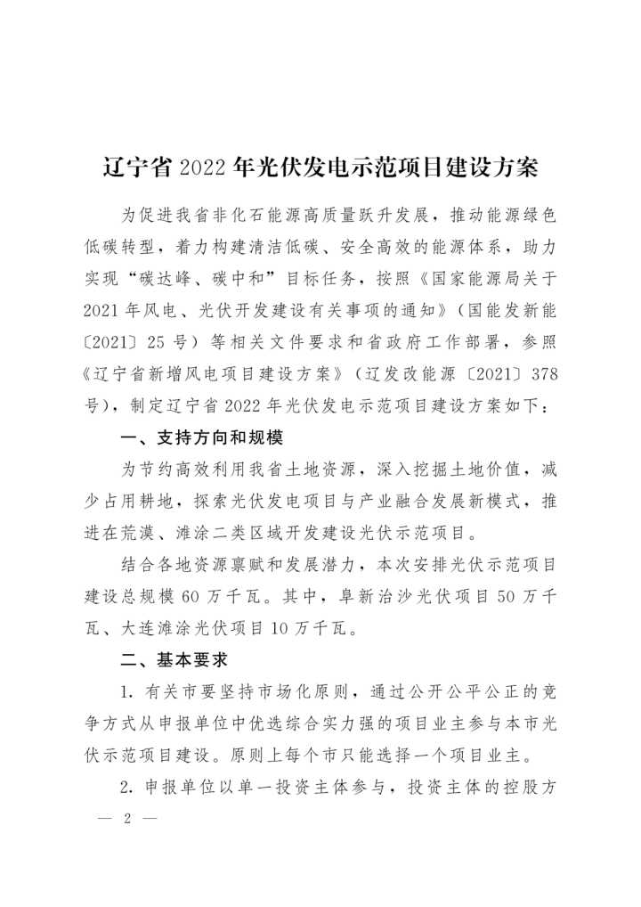 7月12日,遼寧省發(fā)展和改革委員會、遼寧省工業(yè)和信息化廳、國網(wǎng)遼寧省電力有限公司聯(lián)合發(fā)布了《遼寧省2022年光伏發(fā)電示范項(xiàng)目建設(shè)方案》。文件指出結(jié)合各地資源稟賦和發(fā)展?jié)摿?安排光伏示范項(xiàng)目建設(shè)總規(guī)模60萬千瓦。其中阜新治沙光伏項(xiàng)目50萬千瓦、大連灘涂光伏項(xiàng)目10萬千瓦。 同時要求示范項(xiàng)目單體規(guī)模至少10萬千瓦,且不存在土地、環(huán)保、林草、軍事和文物等方面問題。優(yōu)先鼓勵承諾按照建設(shè)光伏功率15%的掛鉤比例(時長3小時以上)配套儲能(含儲熱)設(shè)施,并按照共享儲能方式建設(shè)。納入建設(shè)計劃且完成前期準(zhǔn)備具備開工條件的項(xiàng)目(含承諾建設(shè)的儲能裝置),2023年底前建成。