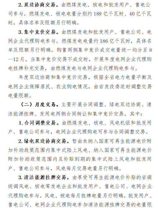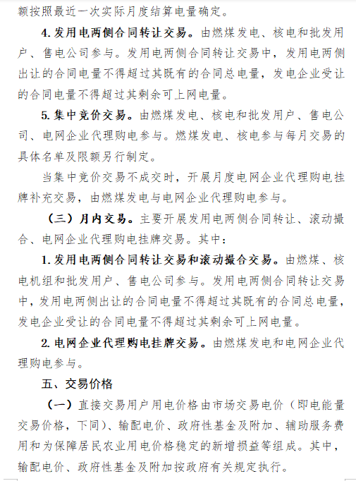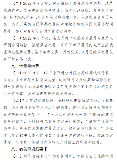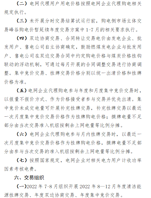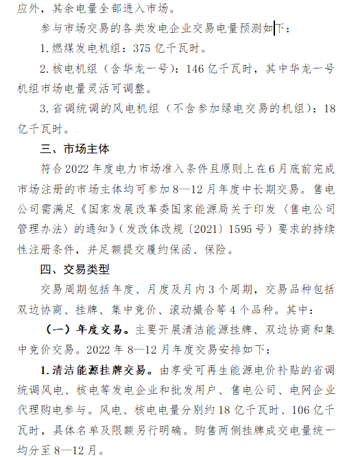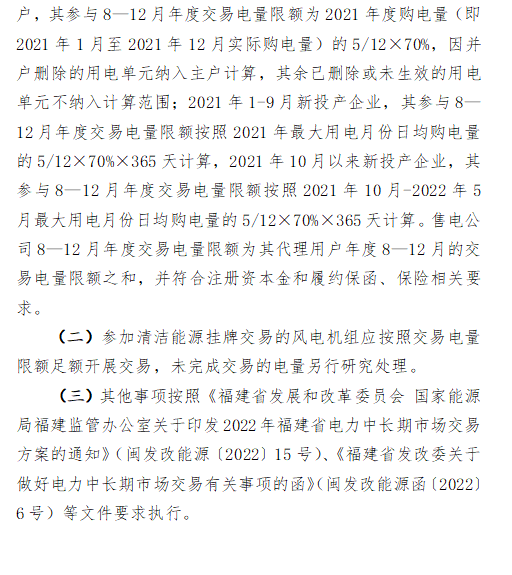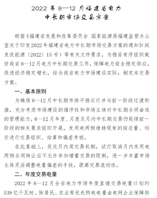 7月14日,福建省發(fā)展和改革委員會 國家能源局福建監(jiān)管辦公室發(fā)布關于2022年8—12月福建省電力中長期市場交易方案的函,其中提到,為貫徹落實國家相關文件精神及工作要求,2022年電力交易要求燃煤發(fā)電企業(yè)全部上網(wǎng)電量通過市場化形成;推動全部10千伏及以上用戶直接進入電力市場;明確用于保障居民、農(nóng)業(yè)等用電價格穩(wěn)定的電源及新增損益的分攤或分享方式;組織開展電力中長期分時段交易及結(jié)算工作;明確電網(wǎng)企業(yè)代理購電交易方式、電價形成方式。 風電、光伏按享受可再生能源補貼電量和未享受可再生能源補貼電量分類參與市場化交易,按年度和月度兩個周期開展。 原文及政策解讀如下: 《2022年8—12月福建省電力中長期市場交易方案》政策解讀 現(xiàn)就《2022年8—12月福建省電力中長期市場交易方案》(以下簡稱《方案》)政策解讀如下: 一、出臺依據(jù) 根據(jù)《國家發(fā)展改革委關于進一步深化燃煤發(fā)電上網(wǎng)電價市場化改革的通知》(發(fā)改價格〔2021〕1439號)、《關于組織開展電網(wǎng)企業(yè)代理購電工作有關事項的通知》(發(fā)改辦價格〔2021〕809號)、《2022年福建省電力中長期市場交易方案》等文件要求,按照省政府有關部署并結(jié)合實際,制定本方案。 二、目標任務 按照“安全穩(wěn)定、統(tǒng)籌兼顧、平穩(wěn)有序”原則,統(tǒng)籌做好發(fā)電計劃放開與電力電量平衡、中長期與現(xiàn)貨市場交易銜接,服務以新能源為主體的新型電力系統(tǒng)建設,促進綠色低碳發(fā)展,并充分考慮工商業(yè)用戶和社會承受能力,有序平穩(wěn)實現(xiàn)工商業(yè)用戶全部進入電力市場,保持居民、農(nóng)業(yè)、公益性事業(yè)用電價格穩(wěn)定,積極穩(wěn)妥推進電力市場交易工作。 三、范圍期限 范圍:符合2022年度電力市場準入條件且原則上在6月底前完成市場注冊的市場主體和電網(wǎng)企業(yè)代理購電;有效期限:2022年8—12月。 四、主要內(nèi)容 為貫徹落實國家相關文件精神及工作要求,2022年電力交易要求燃煤發(fā)電企業(yè)全部上網(wǎng)電量通過市場化形成;推動全部10千伏及以上用戶直接進入電力市場;明確用于保障居民、農(nóng)業(yè)等用電價格穩(wěn)定的電源及新增損益的分攤或分享方式;組織開展電力中長期分時段交易及結(jié)算工作;明確電網(wǎng)企業(yè)代理購電交易方式、電價形成方式。 《方案》設基本原則、年度交易電量、市場主體、交易類型、交易價格、交易組織、計量與結(jié)算、有關事項及要求等8章: (一)明確2022年8—12月電力市場交易電量規(guī)模、各參與交易市場主體。 1.全省除居民、農(nóng)業(yè)等優(yōu)先購電電量由電網(wǎng)企業(yè)保障供應外,其余電量全部進入市場。 2.市場化電力用戶包括直接參與市場交易用戶和由電網(wǎng)企業(yè)代理購電的用戶。 3.水電等其他電源用于保障居民、農(nóng)業(yè)優(yōu)先購電,靈活安排華龍一號核電部分電量用于優(yōu)先購電。 4.燃煤發(fā)電機組、核電機組全部上網(wǎng)電量(除華龍一號機組部分電量外)參與市場交易。已投入商業(yè)運行的風電機組和電化學儲能電站參與市場交易。 (二)明確交易類型和交易開展方式。 1.交易周期包括年度、月度及月內(nèi)3個周期,交易品種包括雙邊協(xié)商、掛牌、集中競價、滾動撮合等4個品種。 2.電網(wǎng)企業(yè)代理購電參與除年度雙邊協(xié)商、月內(nèi)滾動撮合、合同轉(zhuǎn)讓等其他交易。 3.風電、光伏按享受可再生能源補貼電量和未享受可再生能源補貼電量分類參與市場化交易,按年度和月度兩個周期開展。 4.為滿足部分工商業(yè)用戶的綠電需求,開展月度綠電雙邊協(xié)商交易,由未享受可再生能源補貼的風電電量參與。 5.優(yōu)化月內(nèi)周交易機制,試行取消月內(nèi)發(fā)用電兩側(cè)合同轉(zhuǎn)讓后不允許參加增量交易的限制,進一步豐富市場主體靈活調(diào)整電量偏差的手段,提高交易流動性。 (三)明確交易結(jié)算等其他事宜。 1.組織做好4個時段的模擬結(jié)算工作,在此基礎上為加強與現(xiàn)貨市場試運行的銜接,進一步加快中長期分時段交易和結(jié)算進度,2022年8月后開展全天分24個時段的模擬交易和結(jié)算,分時段模擬交易方案另行制定,年底前與現(xiàn)貨市場同步開展不同周期的結(jié)算試運行,結(jié)算試運行期間,市場主體已簽訂的中長期合同按典型曲線等方式進行分解。經(jīng)綜合評估后,與現(xiàn)貨市場適時同步轉(zhuǎn)入分時段正式交易和結(jié)算。 2.按月開展保障居民和農(nóng)業(yè)用電價格穩(wěn)定產(chǎn)生的新增損益清算工作。 3.確保保安全、保供熱、保供應等必開機組簽訂足額中長期合同,并以報量不報價方式參與月度競價、優(yōu)先出清。 原文如下: