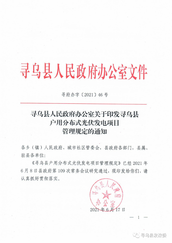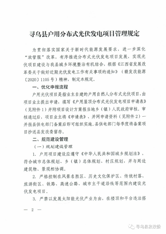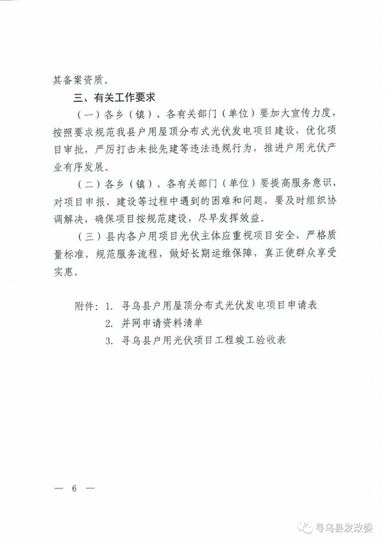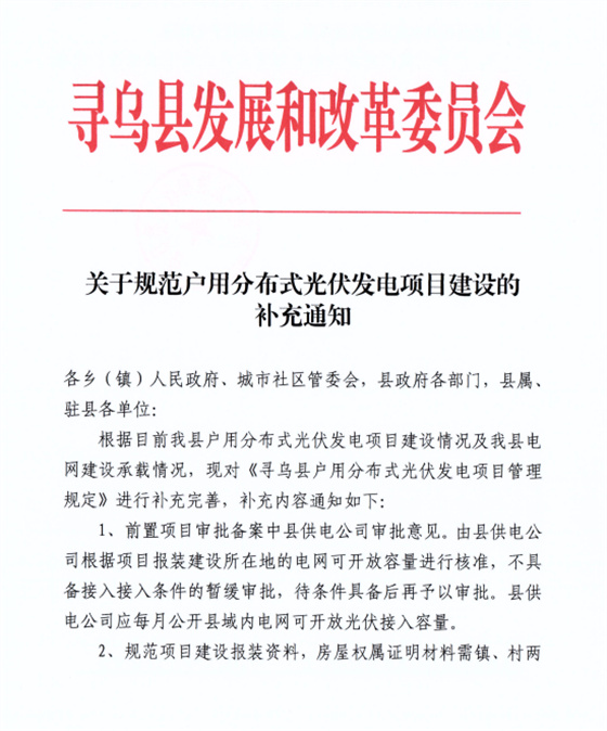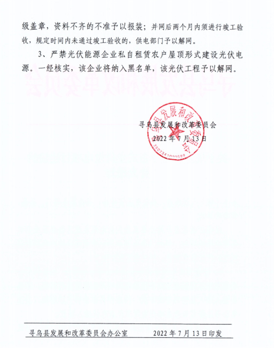 近日,江西省贛州市尋烏縣發(fā)改委印發(fā)《關(guān)于規(guī)范戶用分布式光伏發(fā)電項(xiàng)目建設(shè)的補(bǔ)充通知》,通知明確提出嚴(yán)禁光伏能源企業(yè)私自租賃農(nóng)戶屋頂形式建設(shè)光伏電源。一經(jīng)核實(shí),該企業(yè)將納入黑名單,該光伏工程予以解網(wǎng)。